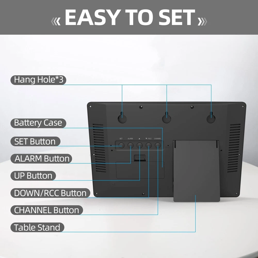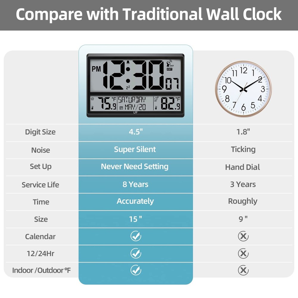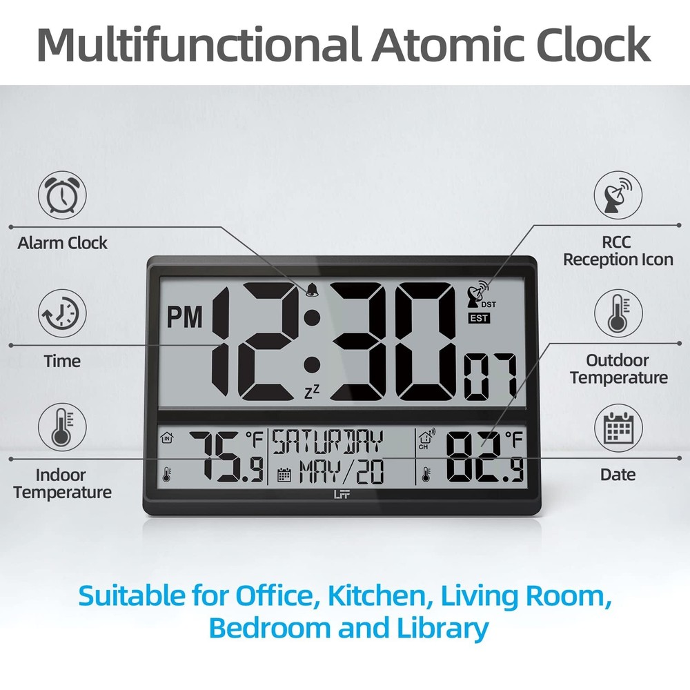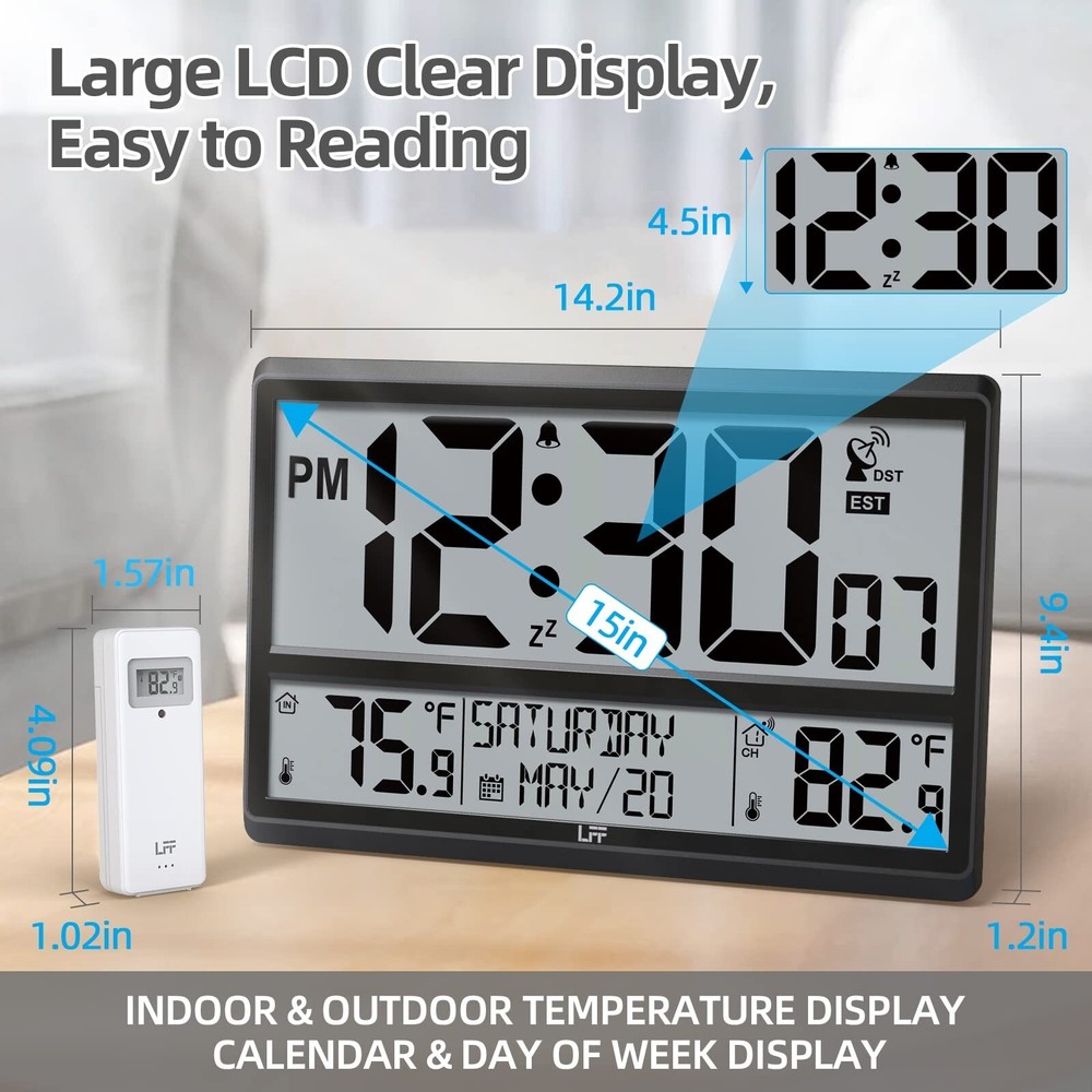 LFF Atomic Clock 4.5" Numbers, Atomic Wall Clock Never Needs Setting, Indoor Outdoor Temperature with Wireless Outdoor Sensor, Battery Powered, Clock for Office, Kitchen, Living Room, Bedroom Product Details Color: Black Brand: LFF MPN: LWC216 UPC: Does not apply EAN: Does not apply Brand: LFF Color: Black Display Type: Digital Style: Classic Special Feature: Large Display, Multiple Time Zone, Temperature Display, Atomic, Calendar Display Product Dimensions: 14.2"W x 9.4"H Power Source: Battery Powered Age Range (Description): Adult Room Type: Kitchen, Living Room, Bedroom, Library, Office Shape: Rectangular Brand: LFF Color: Black Display Type: Digital Style: Classic Special Feature: Large Display, Multiple Time Zone, Temperature Display, Atomic, Calendar Display Product Dimensions: 14.2"W x 9.4"H Power Source: Battery Powered Age Range (Description): Adult Room Type: Kitchen, Living Room, Bedroom, Library, Office Shape: Rectangular Indoor/Outdoor Usage: Indoor Material: Plastic Theme: Plain Frame Material: Acrylonitrile Butadiene Styrene Are Batteries Included: No Mounting Type: Wall Mount Alarm Clock: Yes Watch Movement: Automatic Number of Items: 1 Operation Mode: Atomic Dial Color: Black Clock Form: Multi Display Manufacturer: LFF Item Weight: 2.72 pounds Country of Origin: China Item model number: LWC216 Date First Available: November 10, 2022 Accurate Atomic Clock- The atomic clock has a built-in receiver that automatically synchronizes itself with the WWVB radio broadcast by the US Governments National Institute (NIST) in Fort Collins, Colorado. Digital wall clock adjusts time & calendar to atomic signal automatically, and could count seconds accurately. (Note: No Backlight Display) 15" LCD HD Display- The digital atomic clock has an upgraded large LCD screen with easy to read 4.5" high numbers. It displays the calendar, time (12/24H), day of the week, alarm and indoor/outdoor temperature (C/F). The clock can be used as a wall clock or desk clock and is friendly to the elderly or visually impaired. 6 time zones are available: EST, CST, MST, PST, AKT, HST. Atomic Clocks with Indoor Outdoor Temperature- The clock has built-in high-quality outdoor sensors (included) that transmit accurate measurements of outdoor temperature in F or C to the atomic wall clock. The sensor transmission range is up to 328 feet (100 meters), and the outdoor waterproof rating is IPX4, splash-proof. For the sensor, place the device in an open area away from direct rain, and you can easily understand the temperature both indoors and outdoors. Battery Operated Digital Clock- Atomic clock indoor outdoor temperature is powered by 4 AA batteries (not included), the wireless outdoor sensor is powered by 2 AAA batteries (not included). It has simple manual setting buttons, easy to set, easy to read, easy to use. They are excellent clocks for seniors, and functional and stylish design makes it a perfect decor to kitchen, living room, bedroom, library, and office use. Perfect OBJECT- Large digital wall clock has 3 hanging holes and a bracket, it can not only be placed on the desktop but also can be hung on the wall. Practical and stylish modern design, perfect object for parents, friends on birthday, new year, thanksgiving, christmas and anniversaries. If there is any quality problem, please contact us in time. (Get: 1Atomic Clock; 1Outdoor Sensor; 1Manual) Note: Temperature below -4F require Lithium batteries in the outdoor sensor.