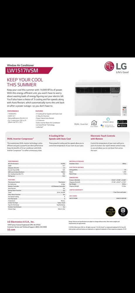 LG LW1517IVSM Dual inverter portable window air conditioner This was purchased a couple of months ago when our central air conditioner needed maintenance. The box was destroyed upon unboxing but has been stored inside our spare room and remains unused. Includes everything that would come with it new. I would prefer local pickup near Portland Oregon, but I am willing to ship it. Please message me for an accurate shipping quote before purchasing. Message me with any questions.