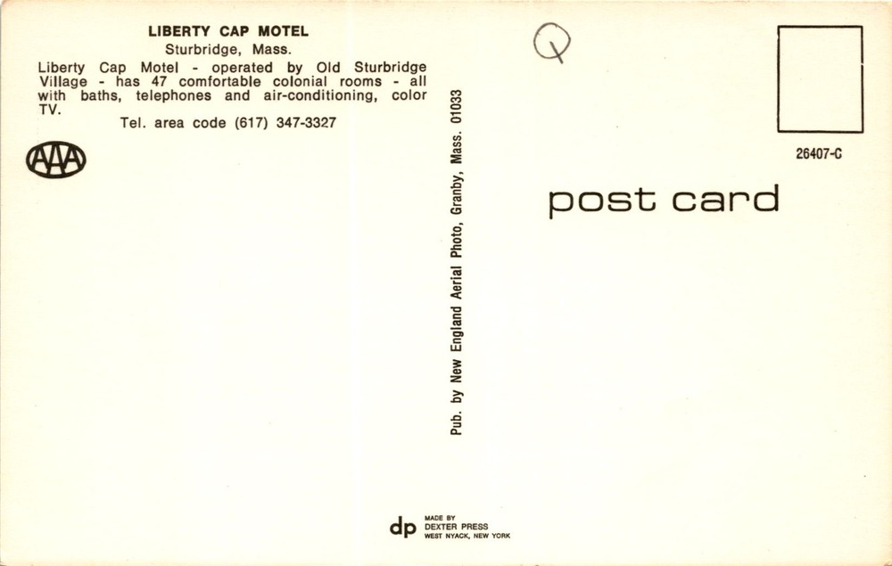 MAKE AN OFFER. THE MORE YOU BUY THE BETTER DEAL I WILL ACCEPT The postcard advertises the Liberty Cap Motel in Sturbridge, Massachusetts. The motel is operated by Old Sturbridge Village and offers 47 comfortable colonial-style rooms, each equipped with baths, telephones, air-conditioning, and color TV. The contact telephone number provided is (617) 347-3327.