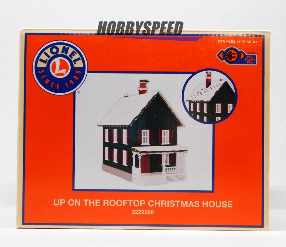 Lionel: 2229290 Lionel Up on the Rooftop Christmas House Grow your Christmas layout with this Up On The Rooftop Christmas House! O Gauge Features: Plug-Expand-Play LED Lighted Interior Santa /Figure for on Chimney LED String Lights around roof PRODUCT SPECIFICATIONS: Gauge: O Gauge Dimensions: 8 1/2" x 4 5/8" x 7" Brand new in the Lionel box!!! Check out our eBay Store for more NEW Lionel, MTH, Bachmann, Atlas and more. We combine shipping on multiple items!! Insurance is Included in S&H Price Please wait for our invoice before payment is sent. We offer discount shipping on multiple items but can ONLY combine shipping if you wait until you are done bidding and receive our final invoice to pay. All items must be paid within 7 days. For Great Customer Service click the "Contact" link just below our description! Shipping price is for Domestic USA only. Hawaii, Alaska, APO's, and Puerto Rico may incur additional S&H International: We Ship Worldwide HOBBYSPEED Value Added Authorized Lionel Dealer INDIANA, PA UNITED STATES OF AMERICA