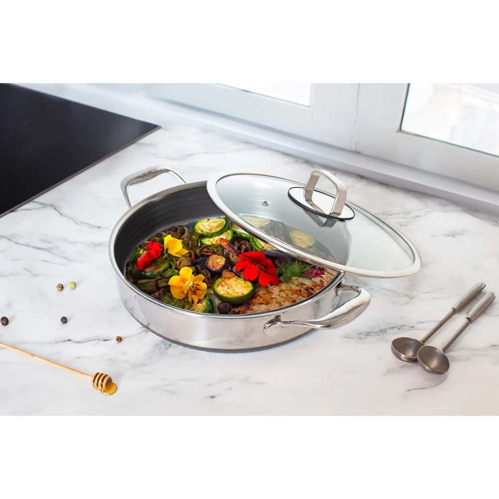 Transform your kitchen with the DiamondClad Hybrid 10-Piece Cookware Set, a premium collection designed to meet all your culinary needs. This versatile set includes a 3QT Pot with Lid, 6QT Pot with Lid, 5QT Sauté Pan with Lid, 1.5QT Sauce Pan with Lid, and a Roaster with Basketeverything you need to create a variety of dishes with ease.Built with advanced DiamondClad technology, each piece in this cookware set features a durable nonstick surface that ensures effortless food release and even heating. The included lids help lock in moisture and flavor, making every meal you cook more delicious. From simmering and sautéing to roasting and more, this cookware set is perfect for both everyday cooking and special occasions. 10-Piece Set: Includes 3QT Pot with Lid, 6QT Pot with Lid, 5QT Sauté Free Shipping Over $49.99* Details LIVWELL DiamondClad 10pc Hybrid Nonstick Stainless Steel Cookware Set Product Description: Transform your kitchen with the DiamondClad Hybrid 10-Piece Cookware Set, a premium collection designed to meet all your culinary needs. This versatile set includes a 3QT Pot with Lid, 6QT Pot with Lid, 5QT Sauté Pan with Lid, 1.5QT Sauce Pan with Lid, and a Roaster with Basketeverything you need to create a variety of dishes with ease. Built with advanced DiamondClad technology, each piece in this cookware set features a durable nonstick surface that ensures effortless food release and even heating. The included lids help lock in moisture and flavor, making every meal you cook more delicious. From simmering and sautéing to roasting and more, this cookware set is perfect for both everyday cooking and special occasions. 10-Piece Set Includes 3QT Pot with Lid, 6QT Pot with Lid, 5QT Sauté Pan with Lid, 1.5QT Sauce Pan with Lid, and Roaster with Basket. DiamondClad Nonstick Surface Provides exceptional durability and easy cleanup. Even Heat Distribution Ensures consistent cooking results every time. Moisture-Locking Lids Maintain the flavor and moisture in your dishes. Versatile Use Ideal for simmering, sautéing, roasting, and more.