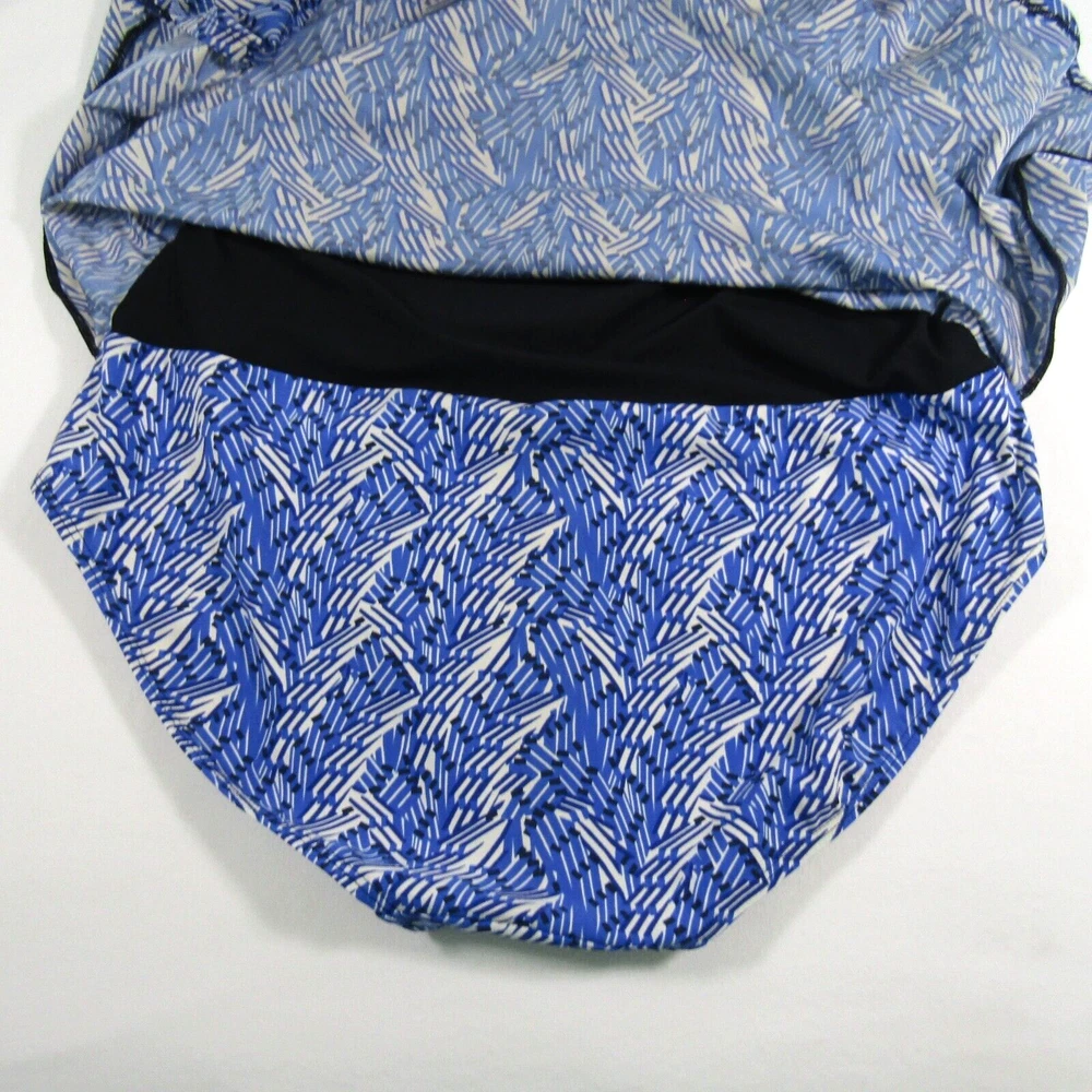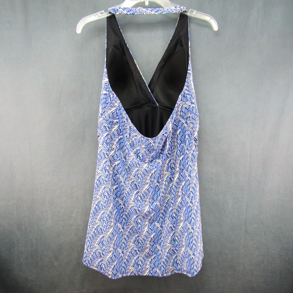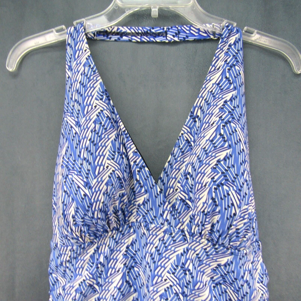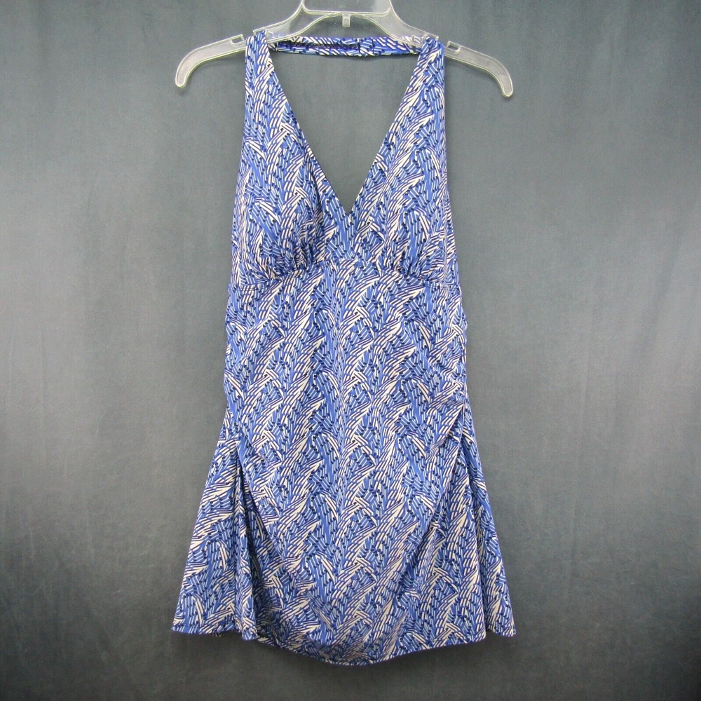 L.L. Bean women's halter neck swim dress with blue and ivory print. One piece swimsuit with dress overlay. Size 16 long. No size tag - size estimated from measurements. Measures 18 inches armpit to armpit. Measures 34 inches center neckband to bottom of dress as pictured (adjustable neckband). Measures 32 inches center neckband to swimsuit bottom as pictured. No fabric content or washing instructions tag. See photos for details and condition.