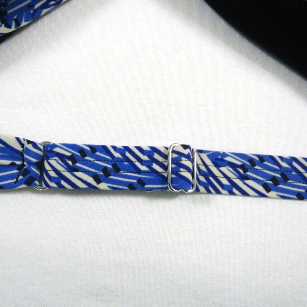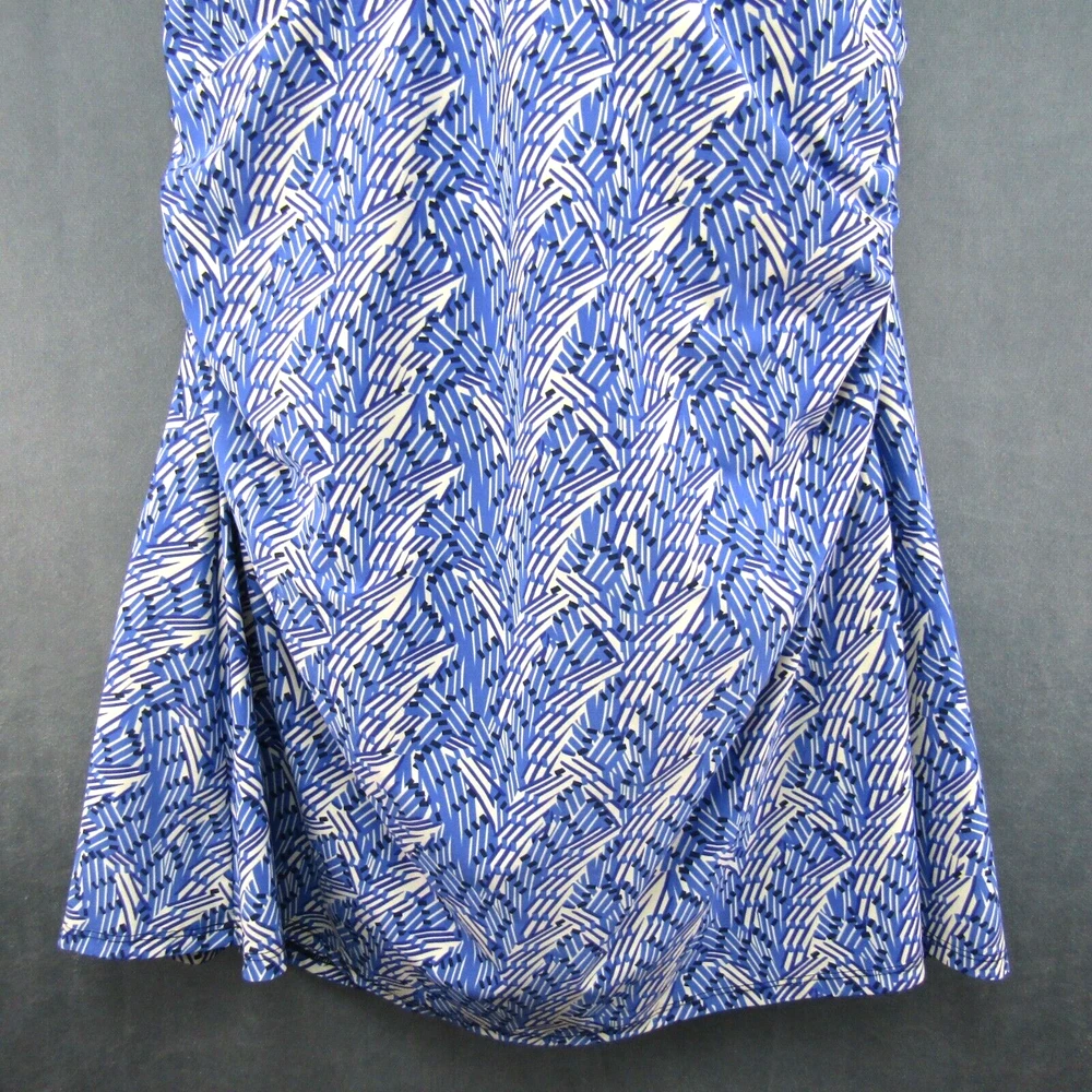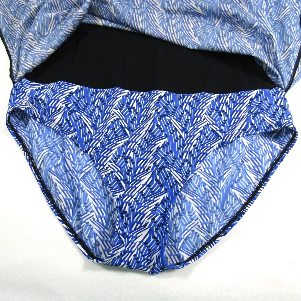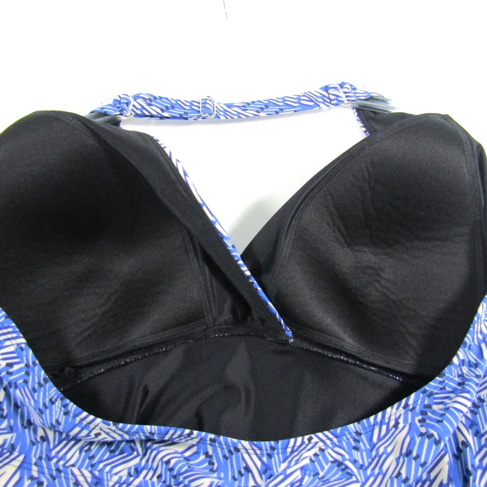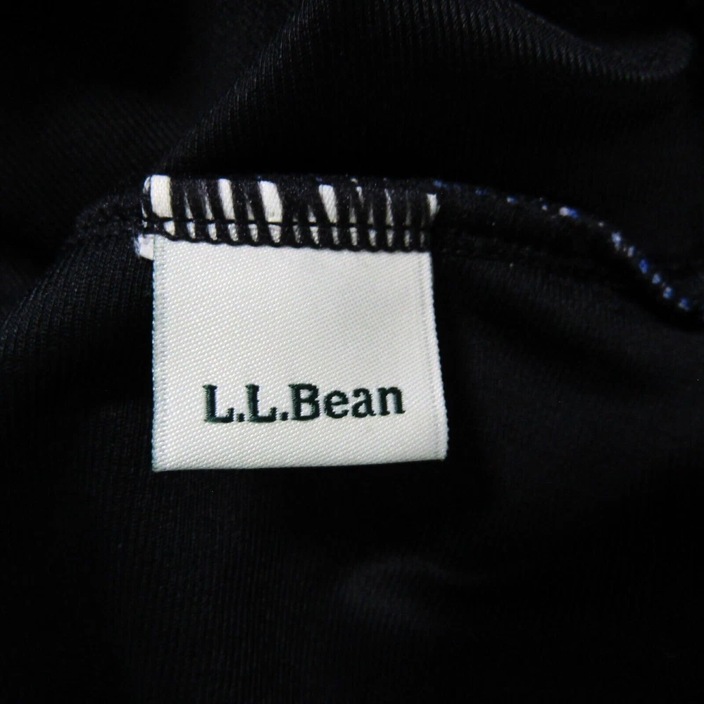 L.L. Bean women's halter neck swim dress with blue and ivory print. One piece swimsuit with dress overlay. Size 16 long. No size tag - size estimated from measurements. Measures 18 inches armpit to armpit. Measures 34 inches center neckband to bottom of dress as pictured (adjustable neckband). Measures 32 inches center neckband to swimsuit bottom as pictured. No fabric content or washing instructions tag. See photos for details and condition.