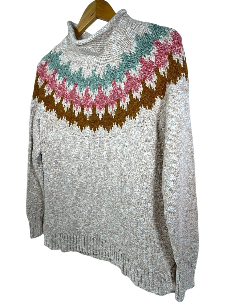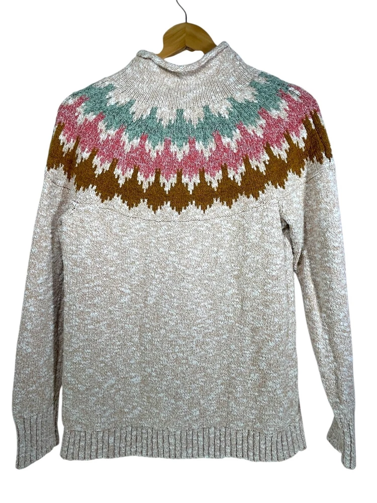 In excellent preowned condition with some signs of wear, neckline is light stretched out L.L Bean Mock Neck Fair Isle Stripe Sweater Womens M Beige-oatmeal with multicolored fair isle printed stripes Cotton knit fabrication Mock neck Long sleeves Thick fabric Relaxed through torso Great for layering Made with cotton Made in China Pit to pit: 17.25” across Full length: 28” #llbean #llbeansweater #mocknecksweater #fairisle #cottonknitsweater #LLBeansweaters #mocksweater #striped #multicolorsweater