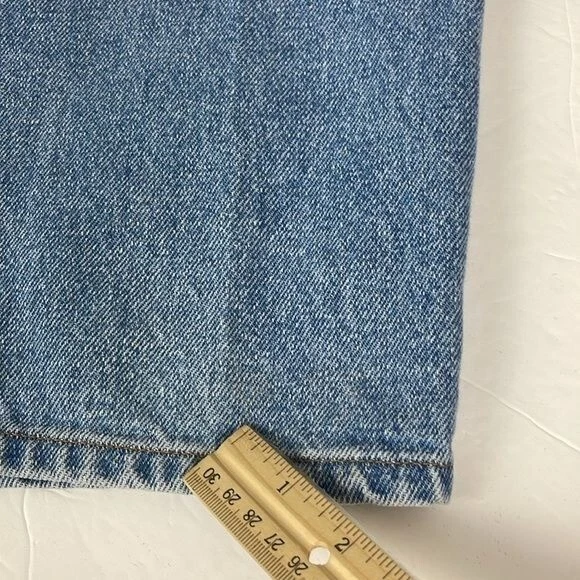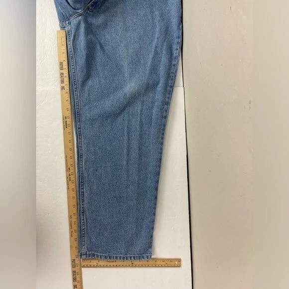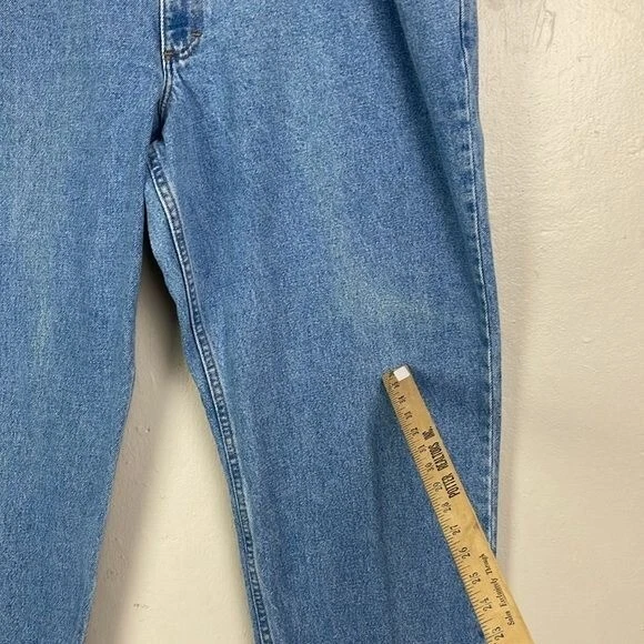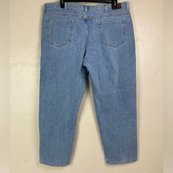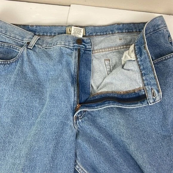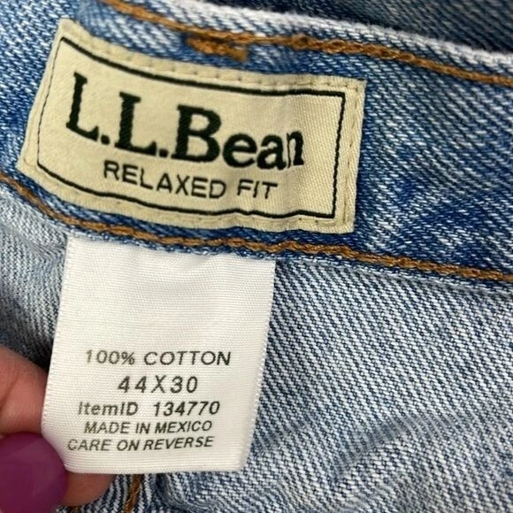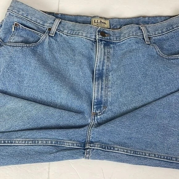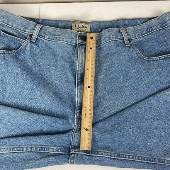 LL Bean Men's Relaxed Fit Jeans 42x28 Actual Measurements work wear outdoor SEE PHOTO back of right leg small faint spot near hem. Light fading on front left leg - Preowned and Smoke free home - 100% Cotton - NO stretch - Light wash Size tag says 44x30 ACTUAL MEASUREMENTS BELOW Waist 42 Inseam 28 Rise 12 PLEASE READ: In time jeans can shrink or stretch. Please see all photos and read listing to see the actual measurements. F9