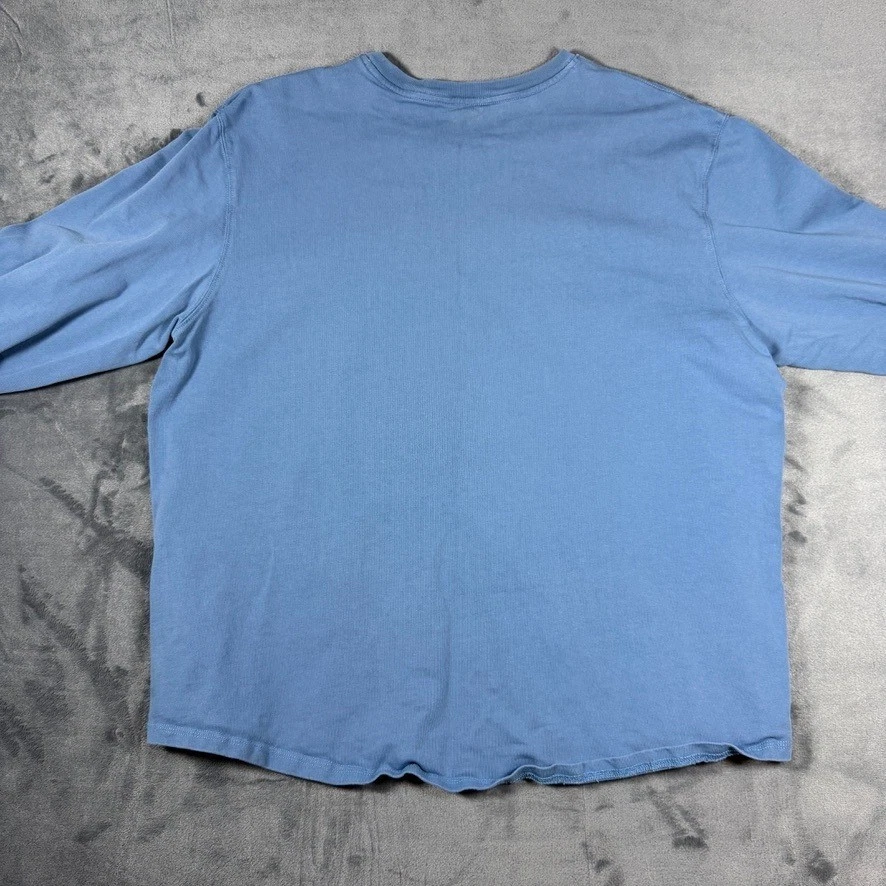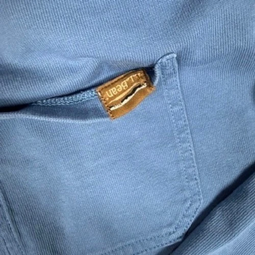 LL Bean long sleeve pocket t-shirt in a classic blue shade. This traditional fit top is crafted from a comfortable cotton blend with a ribbed crew neckline and matching ribbed cuffs. A single chest pocket features the iconic LL Bean mountain logo patch, adding a touch of outdoor heritage to this versatile everyday essential. Perfect for layering or wearing on its own, it offers a relaxed silhouette and durable construction typical of the brand's quality.