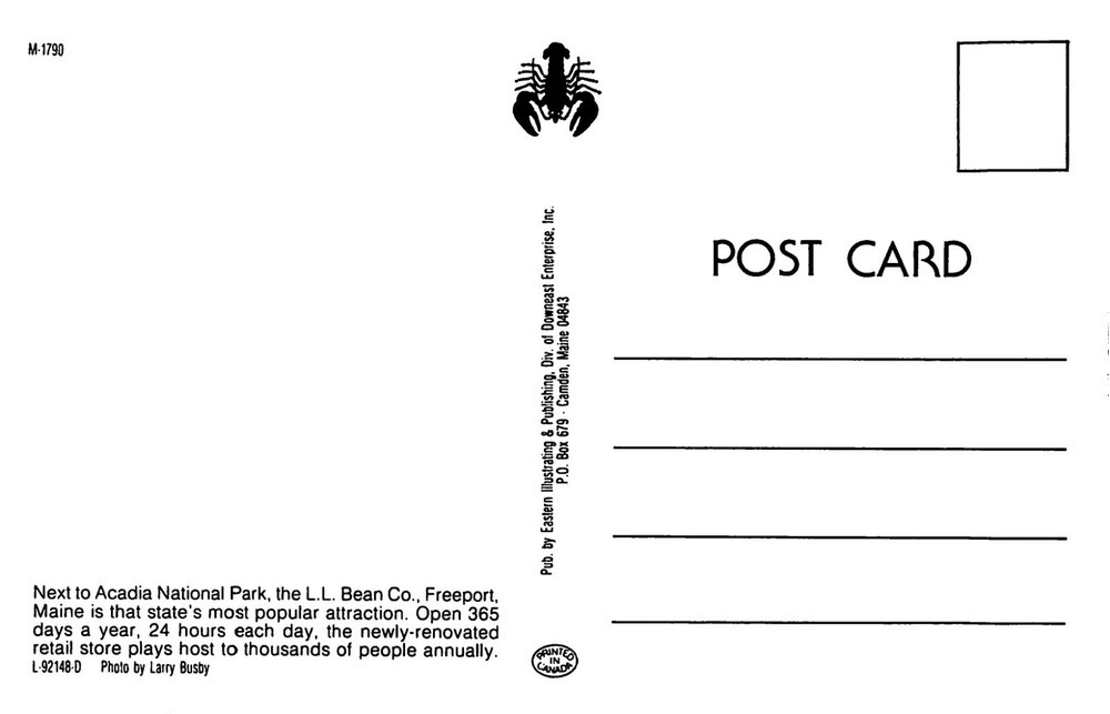 L.L. Bean Retail Store Entrance Freeport Maine Postcard Acadia National Park From the back of the card: Next to Acadia National Park, the L.L. Bean Co., Freeport, Maine is that state's most popular attraction. Open 365 days a year, 24 hours each day, the newly-renovated retail store plays host to thousands of people annually. Measures: 3.5" x 5.5" This FREE SHIPPING option in the USA is offered on this item with the eBay Standard Envelope method, which is a great way to ship. However, if you want this item shipped with a more robust tracking, please upgrade your shipping option to USPS FIRST CLASS PACKAGE or USPS PRIORITY MAIL which provide a more accurate method of scanning.