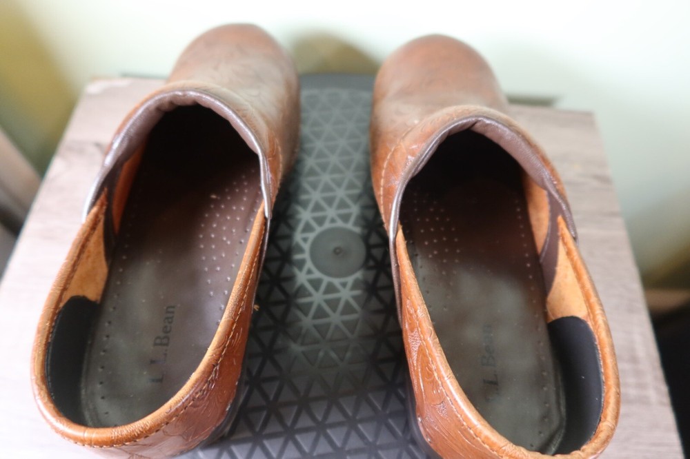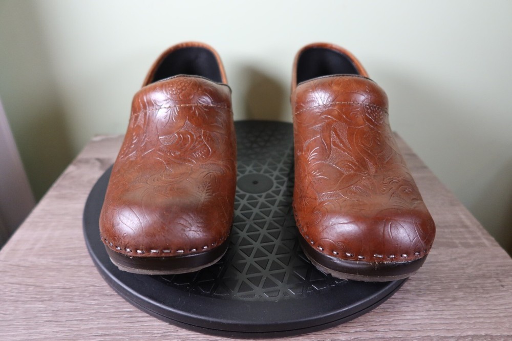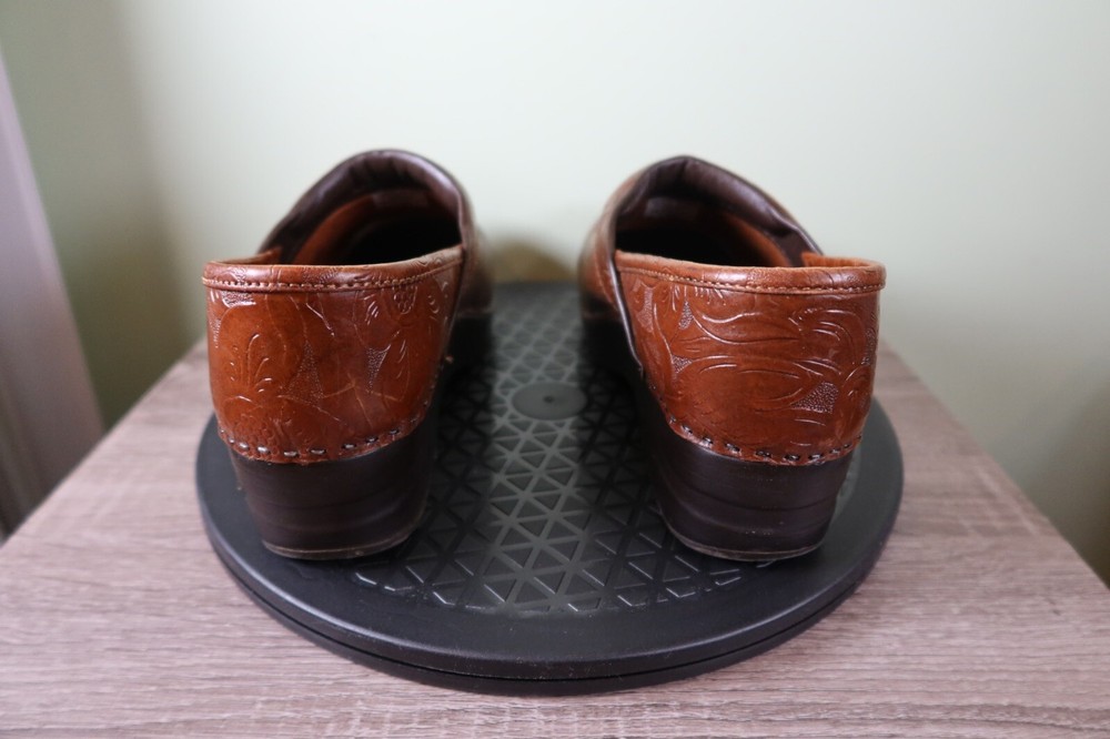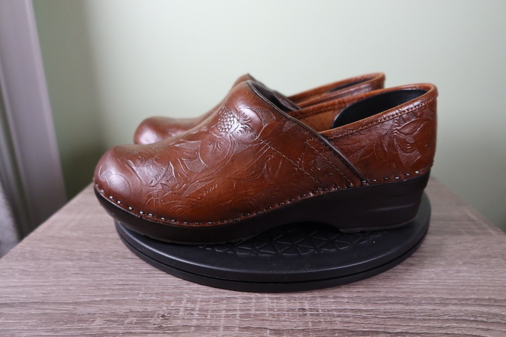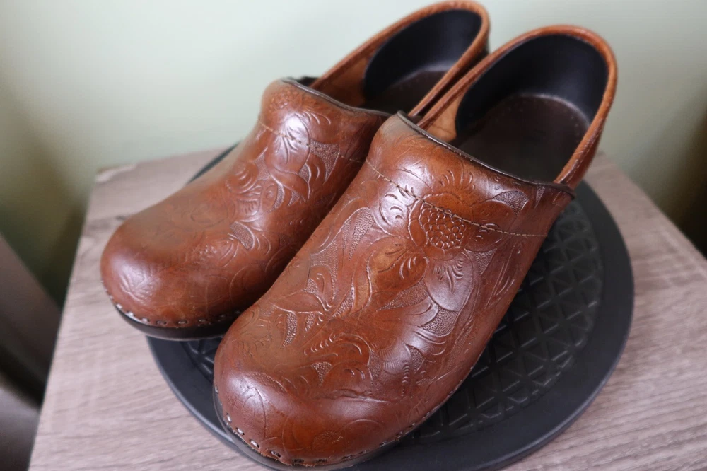 Beautiful floral embossed brown leather clogs in great condition. Some signs of wear on heal, but the sole still has a lot of life in them. Please be sure to review item’s photos prior to purchasing and feel free to message me with any questions. Thanks! :)