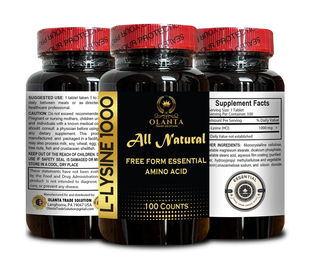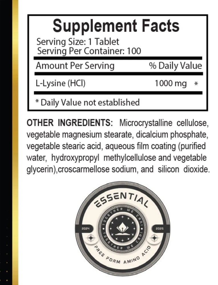 New Template ESSENTIAL FREE FORM AMINO ACID L-LYSINE 1000MG Protein synthesis, Collagen production, Tissue repair, Calcium absorption, Immune support, Nitrogen balance Bone health, Skin health, Wellness support, Stress management 1Bottle 100 Counts Support your health with our premium L-Lysine 1000 mg supplement, a vital amino acid that plays a key role in promoting overall wellness. L-Lysine is an essential building block for protein synthesis in the body, contributing to healthy skin, tissue repair, and the production of collagen. Whether you’re looking to support your immune system, enhance recovery, or maintain a balanced diet, L-Lysine is a versatile addition to your daily routine. Enhance your nutritional support with L-Lysine 1000 mg, the essential amino acid that helps you feel your best every day. Muscle Maintenance: Consuming adequate amounts of lysine may be difficult for individuals with certain needs or dietary restrictions, such as athletes and vegetarians, which can result in a degradation of the body's proteins, including muscle . Promotes Calcium Absorption : It helps the body absorb calcium, contributing to bone health and maintaining strong teeth. L-Lysine Function: This essential amino acid is necessary for growth, development, tissue maintenance, and protein metabolism; Lysine helps support production of important structural proteins like collagen and elastin which form all connective tissue Essential for Protein Synthesis: As an amino acid, L-Lysine is important for the production of proteins, which are essential for muscle development and overall growth. Supports Immune Function: L-Lysine may play a role in maintaining a strong immune system, helping your body stay resilient. Helps Maintain Nitrogen Balance : It contributes to maintaining the proper balance of nitrogen in the body, which is essential for muscle mass and overall health. Promotes Overall Wellness: As an essential amino acid, L-Lysine supports various bodily functions that contribute to overall health and vitality. Supports Stress Management: L-Lysine may help support your body's natural ability to manage stress, promoting a calm and balanced mindset. Enhances Athletic Performance: L-Lysine may aid in muscle repair and recovery, making it popular among those with active lifestyles. New Template Essential Nutrient: Supports your body’s natural balance by delivering a key amino acid for daily wellness. Convenient Daily Supplement: Perfect for adding vital nutrients to your everyday routine with minimal effort. Versatile Support: Ideal for those looking to enhance overall well-being and maintain balance. L-LYSINE 1000 mg FREE FORM AMINO ACID ESSENTIAL - Amino Acid Supplement to Support Synthesis of Collagen, Provides Balance to a High Intake of Arginine, Immune Support - 1 Bottle 100 Counts