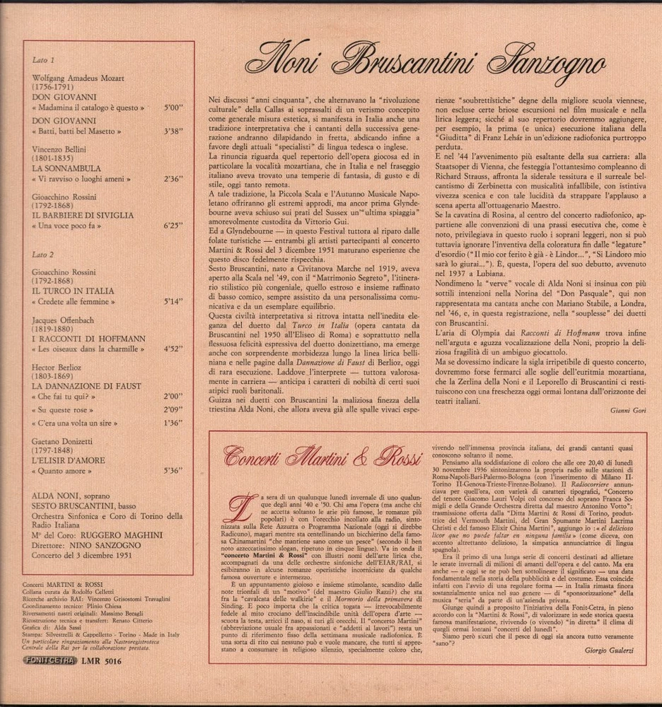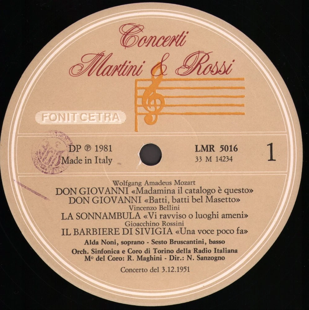 GRADING Our Grading System The table below is an overview of how our grading system works. The first grade is for the sleeve and second grade is for the media/disc, e.g. VG+/EX means that the item's sleeve is in Very Good Plus condition and the media/disc is in Excellent condition. If there is only one condition, e.g. /EX, it means that the item is not in a picture sleeve and that the media/disc is in excellent condition. Records that aren't in picture sleeves will either be in a company sleeve or a generic plain sleeve. If you have any questions, please get in touch. Condition Sleeve Media MINT (10/10) Mint, perfect Mint, perfect EX+ (9/10) Excellent plus, near mint Excellent plus, near perfect EX (8/10) Excellent, well looked after, clean, only slight signs of use Excellent, well looked after, clean, only slight signs of use EX- (7/10) Excellent minus, light wear and signs of use Excellent minus, light wear and signs of use VG+ (6/10) Very good plus, some moderate wear Very good plus, some scuffs, no deep marks VG (5/10) Very good, well used and worn Very good, well used and marked VG- (4/10) Very good minus, very worn Very good minus, very worn and marked GOOD (3/10) Good, some major wear Good, some major wear and scuffing FAIR (2/10) Fair, major wear Fair, major wear and scuffing POOR (1/10) Poor, severe wear Poor, severe wear and scuffing DELIVERY Combined Postage If you add all the items you wish to purchase from us to your shopping basket/cart, and then go to the checkout page from the shopping basket page, the shipping cost will be automatically combined. Packaging All of our items are parcelled using strong specially designed packaging, each vinyl in an order is placed in a clear plastic sleeve and plain paper white sleeve, and is separated from its cover (unless it is advertised as sealed), to prevent any damage during transit. If an item is sealed, and you would prefer the vinyl to be placed outside of its sleeve before dispatch, please let us know. Prices You can see all delivery options and prices for an item on the "Postage and payments" tab. Tracked delivery If you wish to have a tracking number with your order, please select the "Signed" or "Express" delivery option, "Standard" delivery does not include a tracking number. SHOP Click here to view our Ebay shop, with over 200,000 items in stock FAQ Does a used item include the original inner sleeve/insert/poster etc.? We will always include in the description if a used item includes any additional parts, e.g. "with inner" or "includes poster", if you know an item originally came with any additional parts, such as a printed inner sleeve, and it isn't mentioned in the description, then generally the used item won't include it, but please feel free to ask. New items will always be complete, unless otherwise specified. CATEGORIES Shop Home 10" Vinyl Records 12" Vinyl Records 7" Vinyl Records Cassettes (Tape) CDs (Compact Discs) LP Vinyl Records Music Memorabilia Other Artist Noni / Bruscantini / Sanzogno Title Concerti Martini & Rossi Format LP Vinyl Country Italy Label Fonit Cetra Catalogue Number LMR5016 Year 1981 Description 8 track stereo Condition (Sleeve/Disc) VG+/EX Track List Concerto Del 3 Dicembre 1951 A1. Don Giovanni: "Madamina, Il Catalogo E Questo" (5:00) A2. Don Giovanni: "Batti, Batti O Bel Masetto" (3:38) A3. La Sonnambula: "Vi Ravviso O Luoghi Ameni" (2:36) A4. Il Barbiere Di Siviglia: "Una Voce Poco Fa" (6:25) B1. Il Turco In Italia: "Credete Alle Femmine" (5:14) B2. Les Contes D'Hoffmann: "Les Oiseaux Dans La Charmille" (4:52) B3. La Dannazione Di Faust: "Che Fai Tu Qui?... Su Queste Rose... C'Era Una Volta Un Sire" (5:45) B4. L'Elisit D'Amore: "Quanto Amore" (5:36) DELIVERY INFORMATION If you wish to have a tracking number with your order, please choose the Signed or Express delivery option, the Standard delivery option does not include a tracking number. Please note, the Express option for delivery outside of the UK includes a tracking number, but has the same delivery time as the Standard option. ABOUT US Vinyl Tap has been in the business of selling music for over 30 years, and in that period we have supplied many thousands of collectors and music fans around the globe with vinyl, CDs and music memorabilia. You can check out the over 200,000 items that we have in stock on our Ebay shop, here . Artist: Noni / Bruscantini / Sanzogno - Title: Concerti Martini & Rossi - Format: LP Vinyl - Country: Italy - Label: Fonit Cetra - Catalogue Number: LMR5016 - Year: 1981 - Description: 8 track stereo