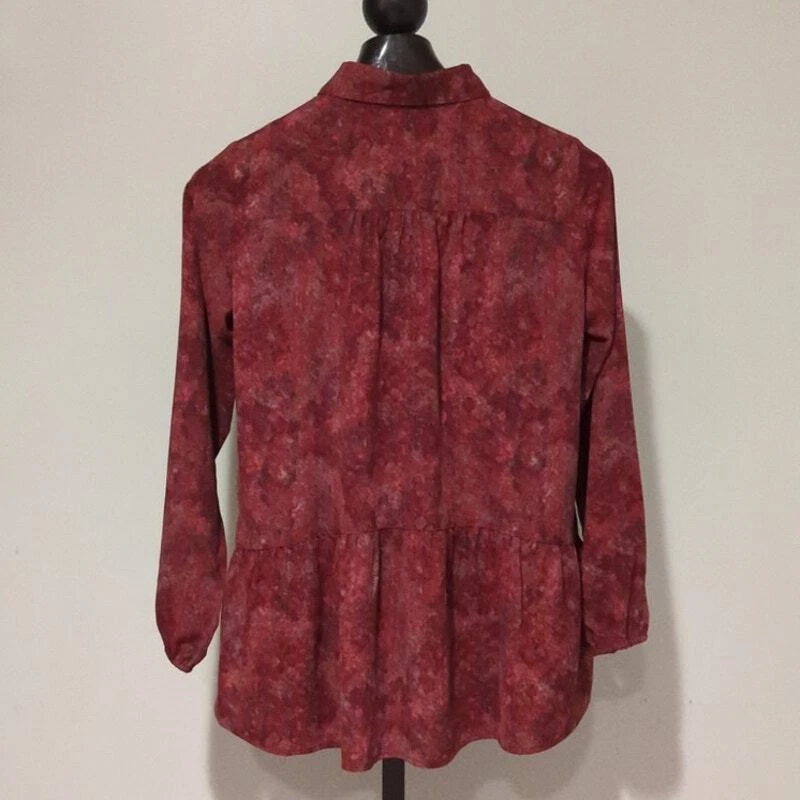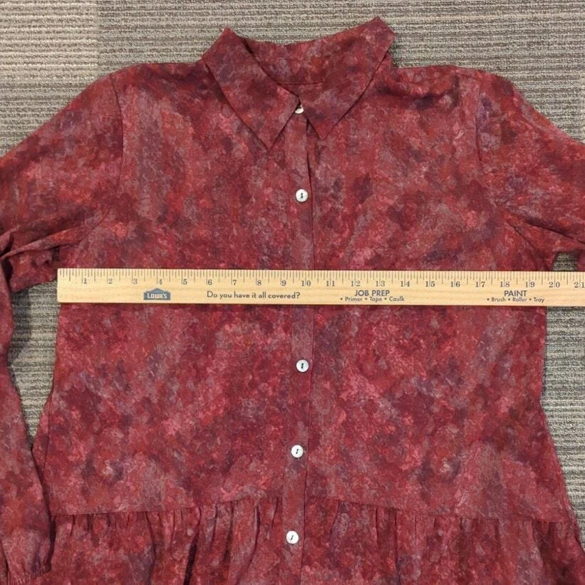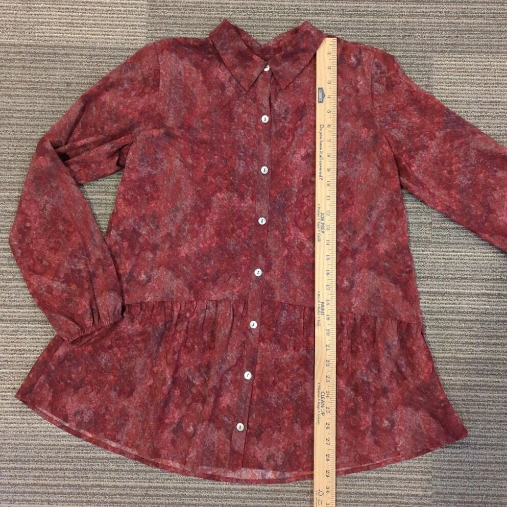 LOGO by Lori Goldstein Button Front Tunic Top Blouse with Peplum Size Small. Fits oversized. Long Sleeves Red and Purple Watercolor Pattern Excellent Preowned Condition! No observed stains or holes.