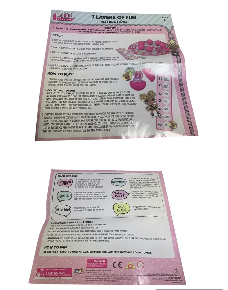 LOL Surprise 7 Layers Of Fun The Game * Game is complete This board game contains: - 1 Game board - 1 Spinner - 7 Surprise Balls - 4 Accessories - 4 Movers - 4 Mover Stands - 28 Tokens - 4 Collector’s Cards - 1 Instruction Sheet * The box has shelf wear some tearing & dents. The game itself is in like new condition. Please let me know if you have any questions. Thank you Personal notes: (pink 4)