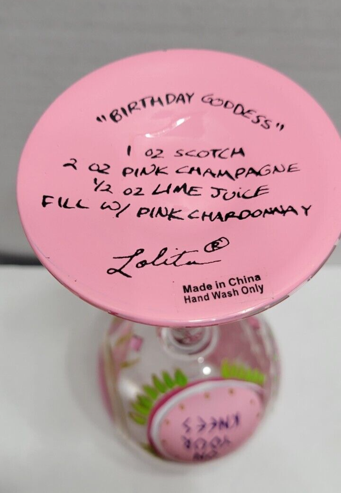 Lolita Birthday Goddess wine glass. Has drink recipe on the bottom. Great Birthday gift for the Goddess in your life!See photos.