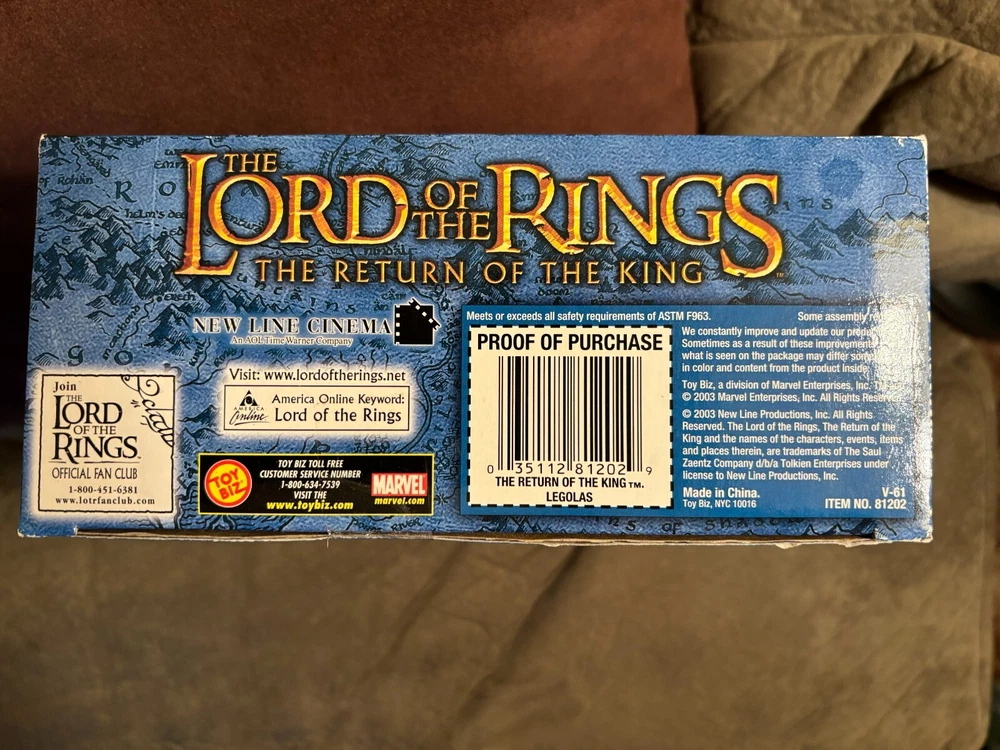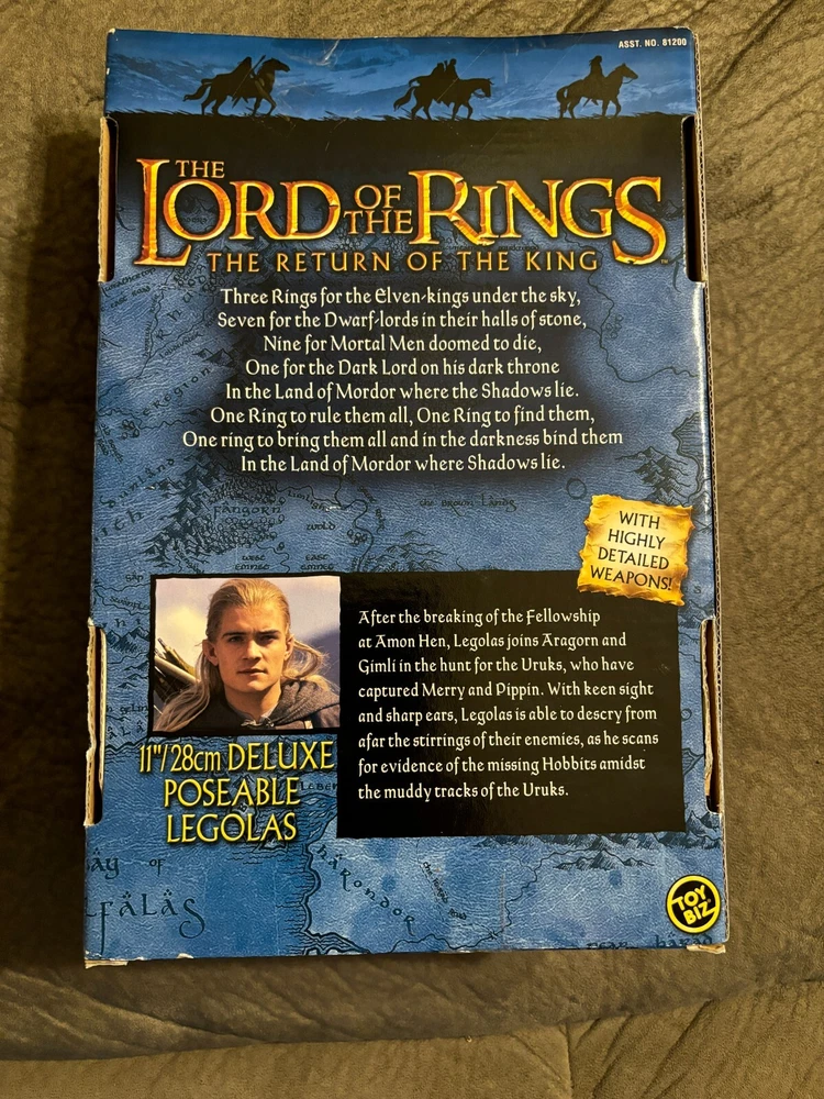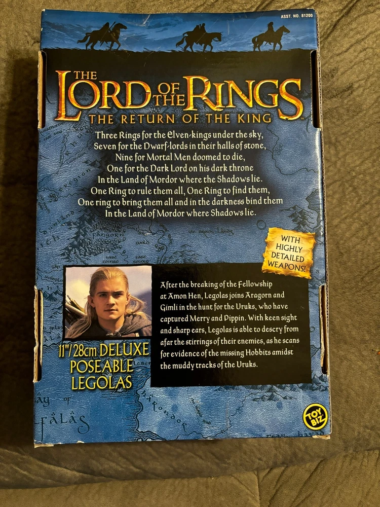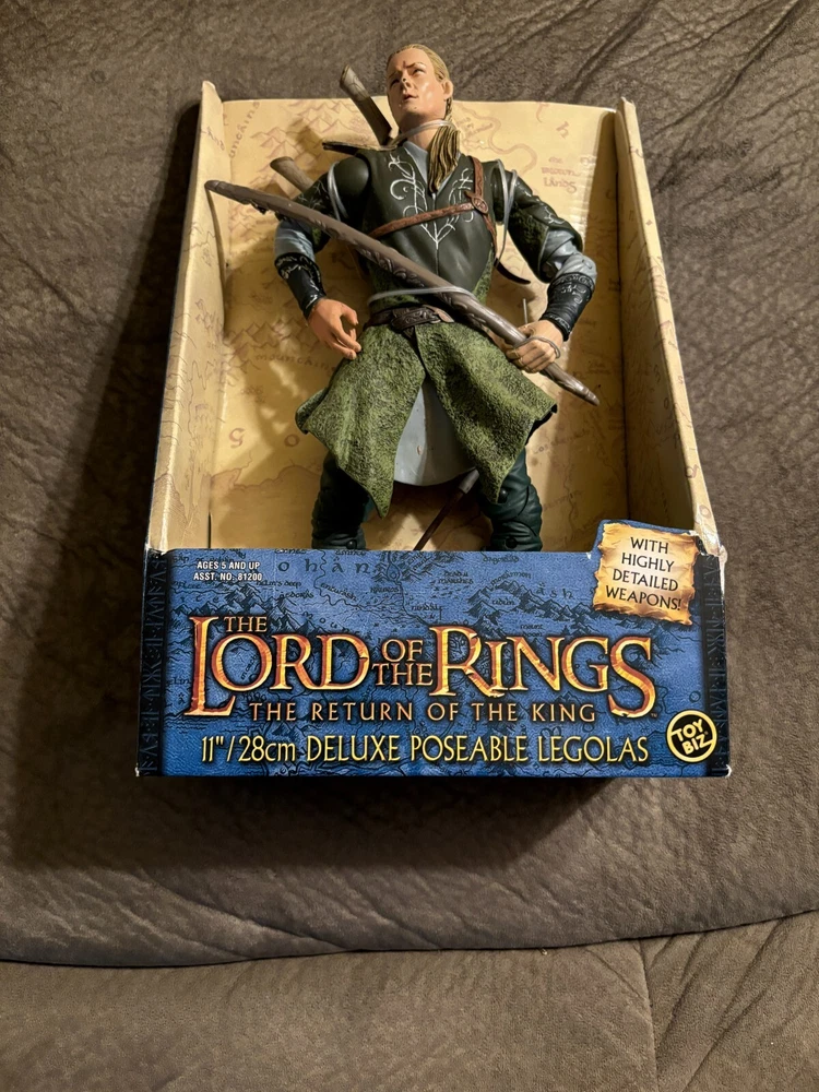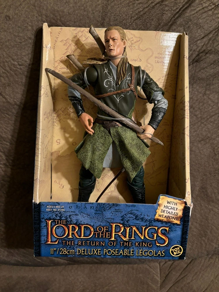 HERES A GREAT ACTION FIGURE FROM TOY BIZ !! ITS LEGOLAS FROM LORD OF THE RINGS RETURN OF THE KING !! AN 11 INCH TALL POSEABLE FIGURE !! PRETTY COOL!! THERE IS A MARK ON HIS NOSE LOOKS LIKE PAINT CHIPPED !! CHECK THE PICTURES WHAT YOU SEE IS WHAT YOULL GET !! .BUYER PAYS 13.50 FOR USPS SHIPPING IN THE USA ONLY!!TRANSACTION MUST BE COMPLETE AT AUCTION END.I ACCEPT PAYMENTS THROUGH PAYPAL ONLY!! THANKS FOR LOOKING!! I DO COMBINE SHIPPING SO PLEASE CHECK MY OTHER ITEMS!! IF YOU DONT LIKE MY PRICES MAKE ME AN OFFER!! THE WORST I CAN DO IS SAY NO