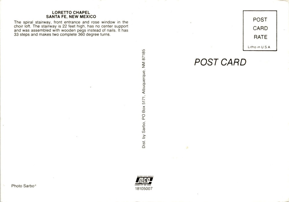 MAKE AN OFFER. THE MORE YOU BUY THE BETTER DEAL I WILL ACCEPT The postcard features the Loretto Chapel in Santa Fe, New Mexico, showcasing its spiral stairway, front entrance, and rose window in the choir loft. The unique spiral stairway is 22 feet high, has no center support, and was constructed using wooden pegs instead of nails. It consists of 33 steps and makes two complete 360-degree turns.