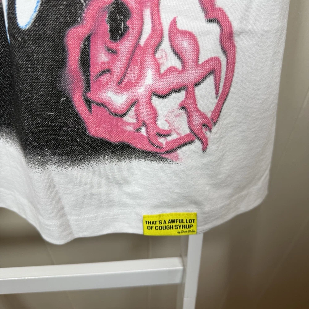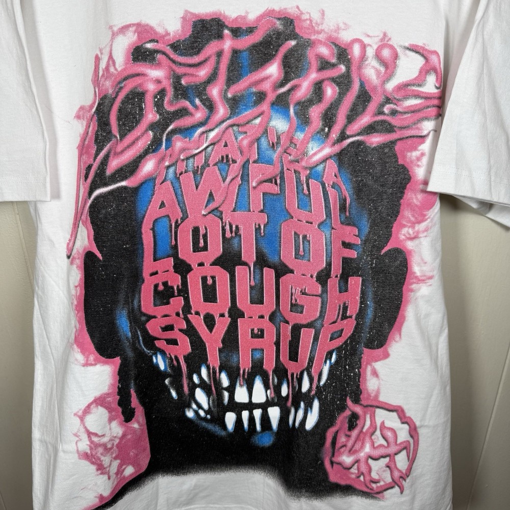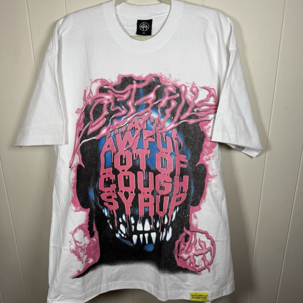 The product is a limited edition XL white T-shirt featuring a graphic print from the collaboration between Awful Lot Of Cough Syrup and Lost Hills. This tee has a relaxed fit with a crew neck and short sleeves, made of heavyweight cotton knit fabric. The shirt is machine washable and suitable for summer and spring seasons. It is a part of the Gildan 5000 product line and is not vintage, personalized, or handmade. The design themes include streetwear, music, and graphics, making it a stylish addition to any man's wardrobe. ****Rare listed under retail **** ****Brand New never worn**** ****Street Wear at it’s best ****