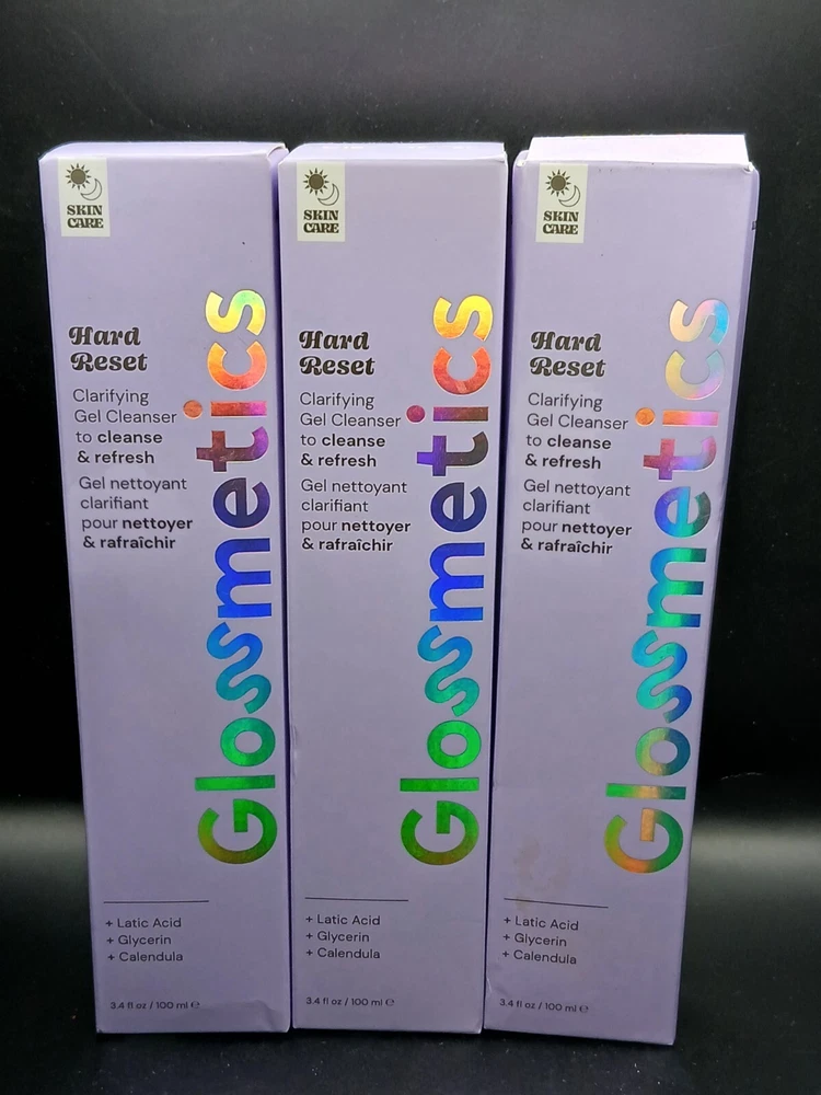 Glossmetics Hard Reset Clarifying Gel Face Cleanser Short Description: Achieve a clean and refreshed complexion with Glossmetics Hard Reset Clarifying Gel Face Cleanser. This hydrating makeup remover is specially formulated for normal to combination dry skin, featuring a blend of calendula, lactic acid, and glycerin to cleanse, hydrate, and soothe your skin. Key Features: Clarifying Cleanser: Effectively removes makeup, dirt, and impurities without stripping the skin. Hydrating Formula: Infused with glycerin to provide moisture and prevent dryness. Gentle Exfoliation: Contains lactic acid to gently exfoliate dead skin cells, promoting a smooth and radiant complexion. Soothing Ingredients: Calendula extract helps calm and soothe the skin, reducing redness and irritation. Suitable for Normal to Combination Dry Skin: Specifically designed to meet the needs of normal to combination dry skin types.Ingredients: Active Ingredients: Calendula Extract, Lactic Acid, Glycerin Other Ingredients: Water (Aqua), Cocamidopropyl Betaine, Sodium Lauroyl Sarcosinate, Acrylates Copolymer, Sodium Chloride, Phenoxyethanol, Ethylhexylglycerin, Fragrance (Parfum), Disodium EDTA. Warnings: For External Use Only: Avoid contact with eyes. If contact occurs, rinse thoroughly with water. Patch Test Recommended: Before first use, perform a patch test to check for any adverse reactions. Discontinue Use if Irritation Occurs: If you experience irritation or discomfort, stop using the product and consult a healthcare professional if necessary. Keep Out of Reach of Children: Ensure this product is kept out of the reach of children. 3-Pk GLOSSMETICS HARD RESET Clarifying Gel Cleanser Glycerin 3.4 OZ NEW In Box.