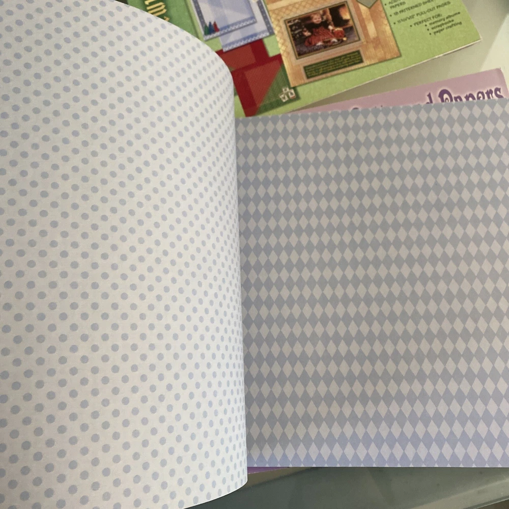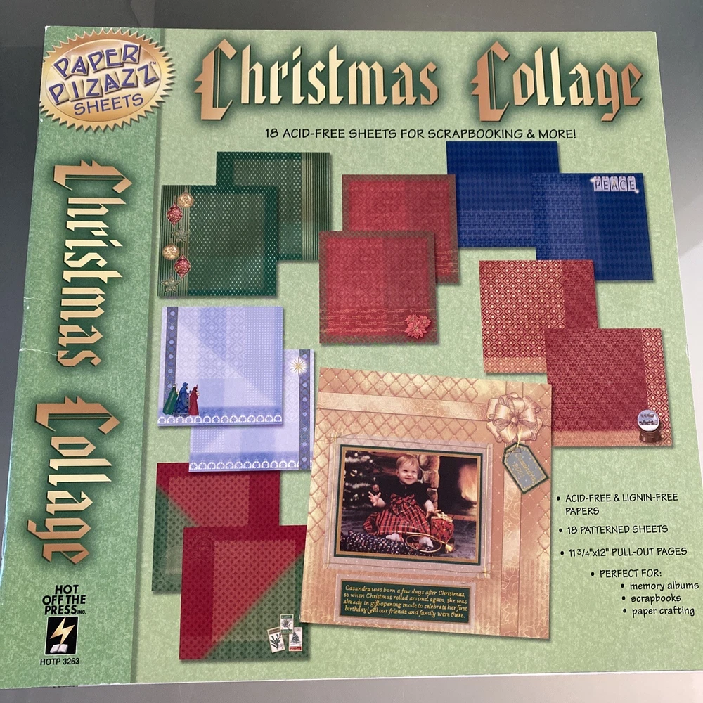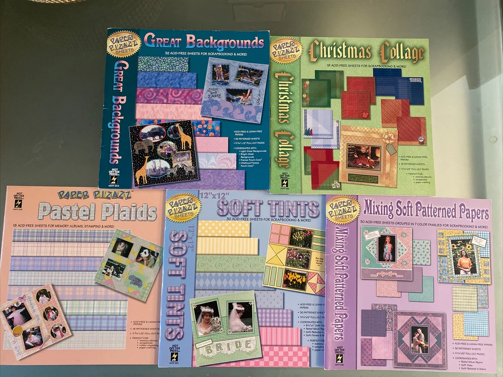 This lot contains 5 packs of Paper Pizazz scrapbooking paper in holiday and Christmas designs. The sheets are 11.75x12 inches in size and are acid-free for long-lasting preservation of your memories. The colorful designs are perfect for adding a festive touch to your scrapbook pages or other crafting projects. These sheets are made in the United States and are sure to enhance any holiday-themed project. All books appear to be unused and NEW!