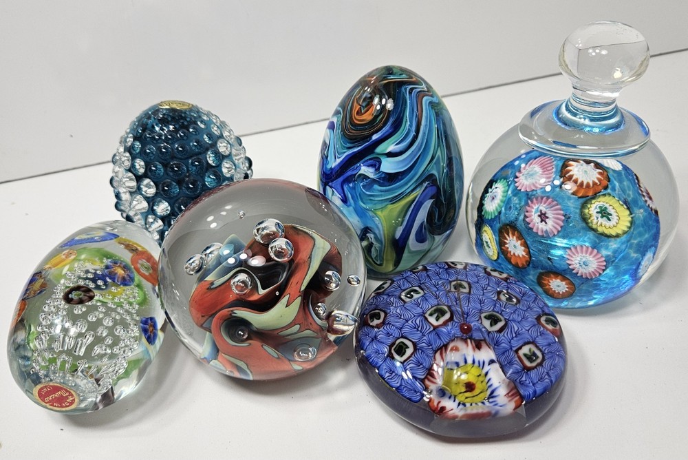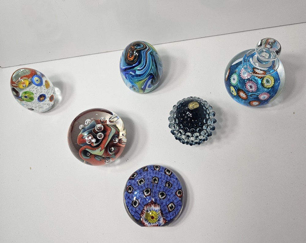This lot of 6 vintage Murano glass paperweights features a beautiful swirl pattern in multicolored glass, made with the traditional hand-blown production style and glossy finish. Each paperweight is uniquely handmade with an incised backstamp, showcasing the intricate craftsmanship and art glass production technique. These decorative pieces are perfect for adding a touch of antique charm to any collection or space.