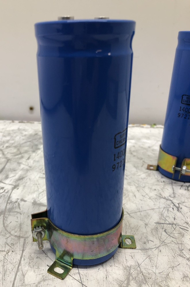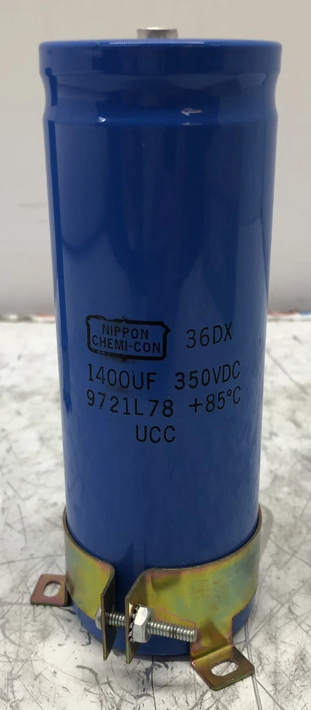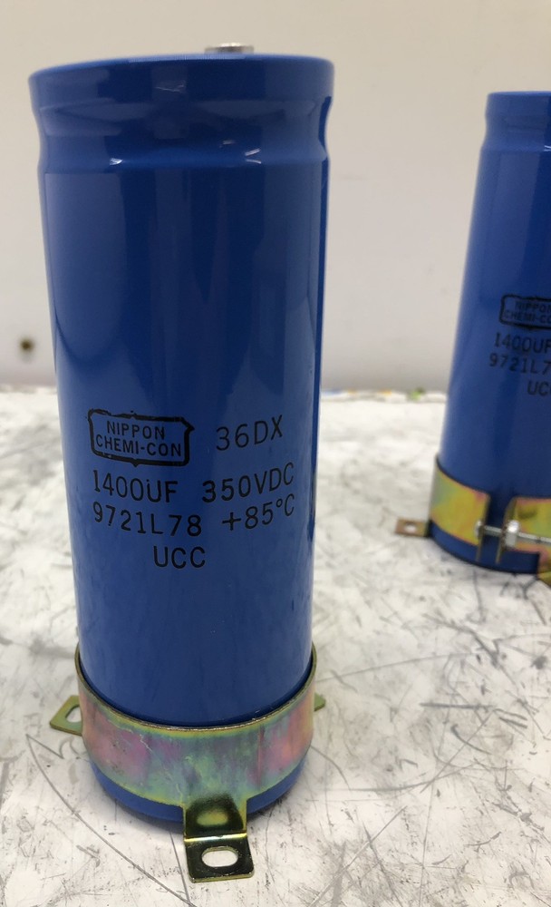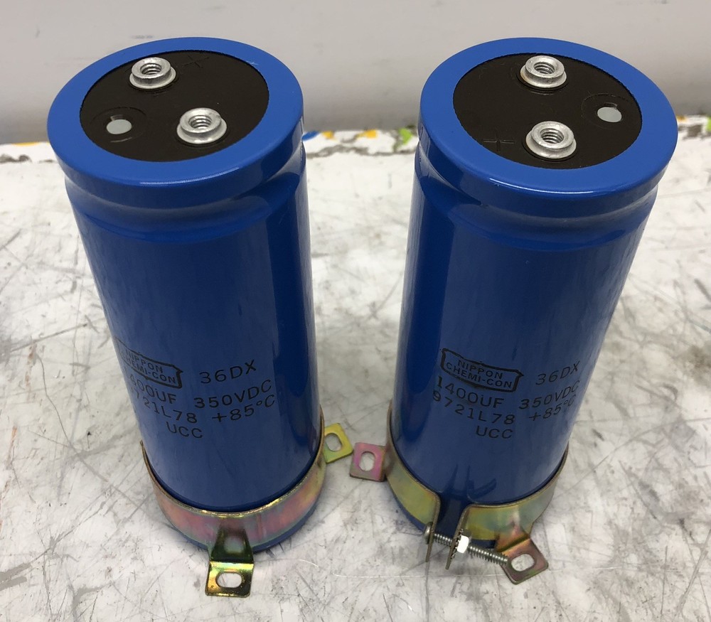 LOT OF TWO(2) USED NIPPON CHEMI-CON LARGE CAN CAPACITORS 36DX 1400UF 350VDC 9721L78 +85C UCC ONE IS MARKED WITH A "3" on top, while the other is marked "13". See photos for more information BOTH CAPACITORS HAVE CLAMP STYLE RETAINING BRACKETS. SEE PHOTOS FOR MORE INFORMATION FREE SHIPPING TO THE LOWER 48 UNITED STATES ONLY All shipping prices are quoted for The Lower 48 United States. We can only ship to the address provided at checkout. We only ship outside of the U.S.A. using the eBay International Shipping program. If a third party/courier shipper is used we are NOT liable AFTER the item leaves the address provided at checkout. 30 Day DOA Warranty HMF