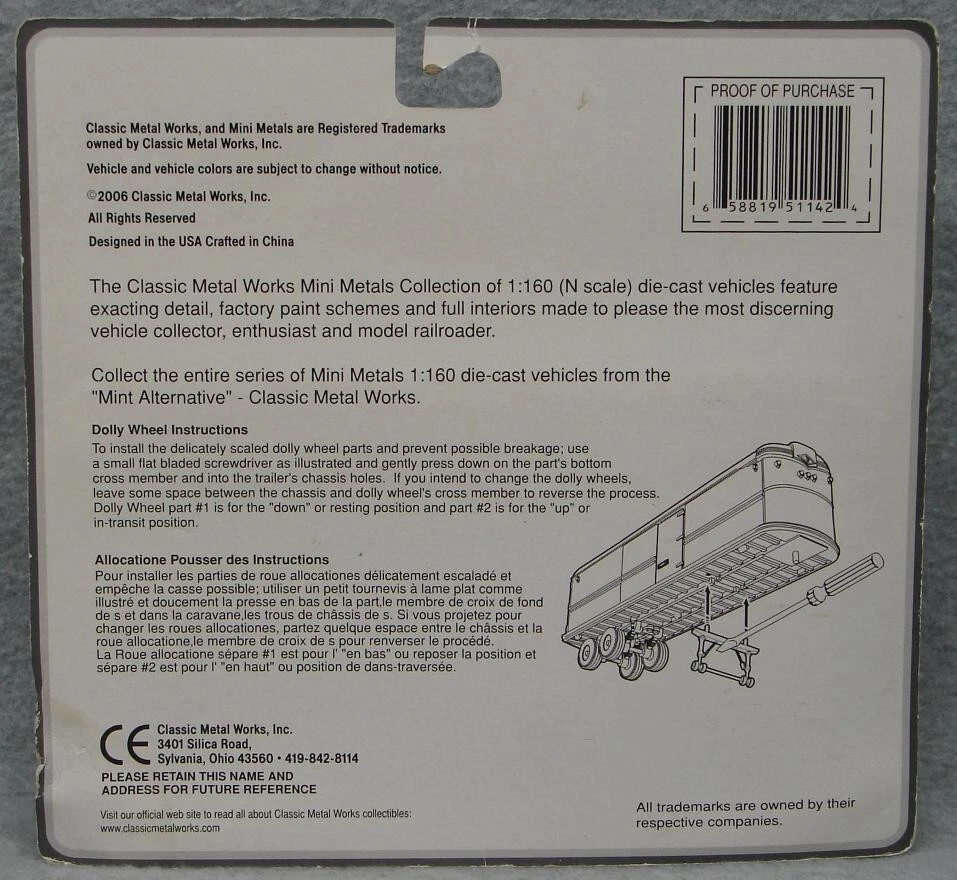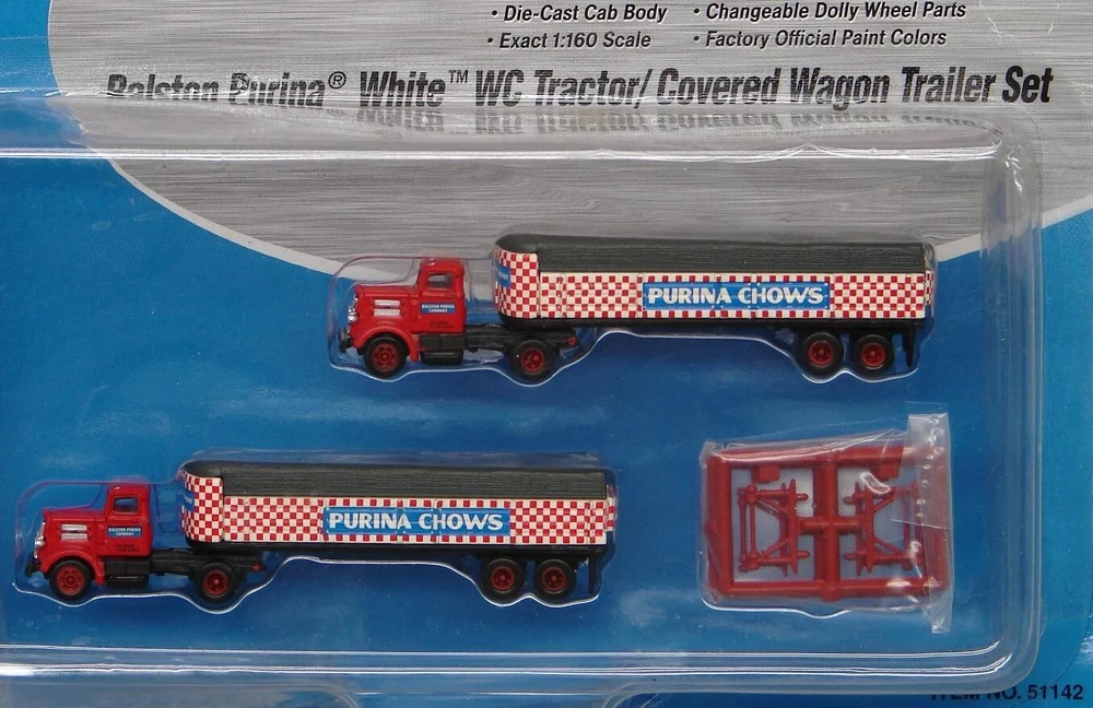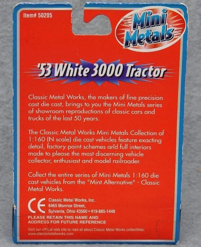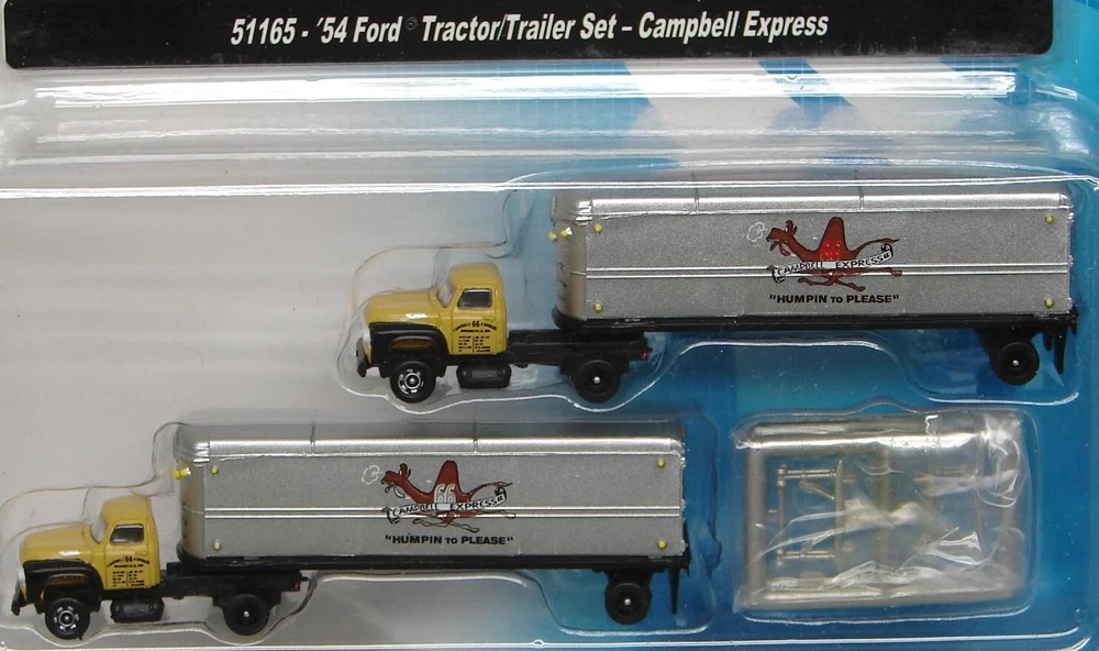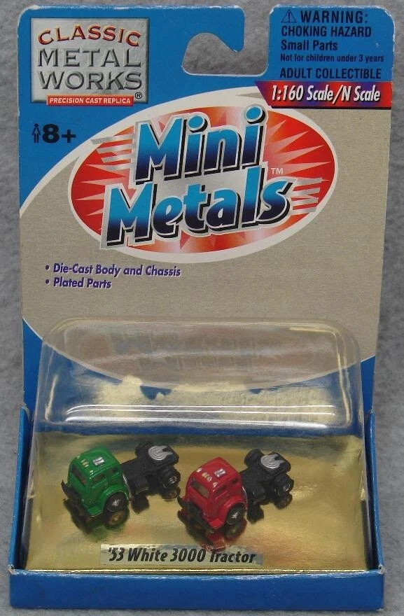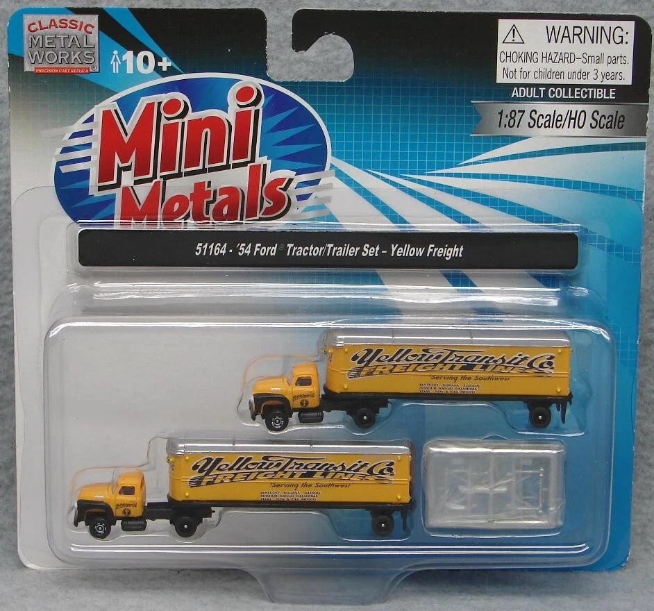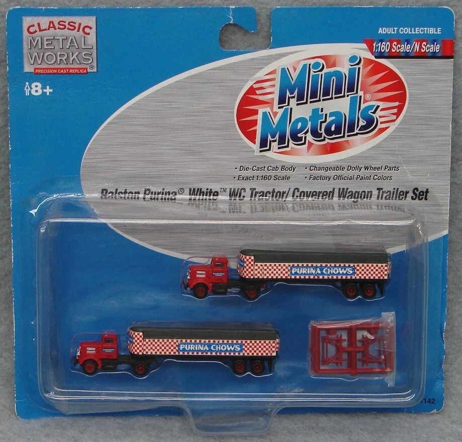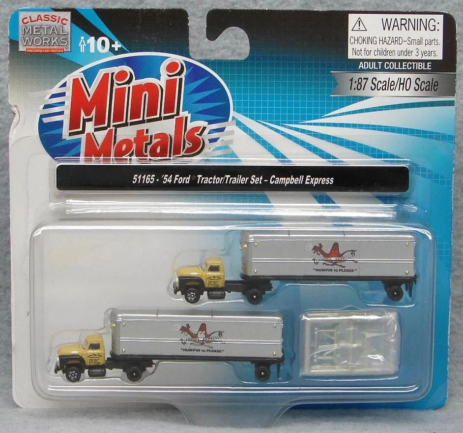 Believe it or not, I still have many items from that large N-scale Train collection I acquired some time ago! I'm trying to get back to listing a few fresh lots from that, so please check in with Saler's other items from time to time! This is a LOT of 4 New-In-Package 1:160 / N Scale Classic Metal Works MINI METAL Tractor-Trailers (2 per card for Total of 8) , including: #51142: Ralston Purina White WC Tractor/Covered Wagon Trailer Set #50205: '53 White 3000 Tractor #51164: Yellow Transit Co. Freight Line '54 Ford Tractor/Trailer Set #51165: Campbell Express "Humpin to Please" '54 Ford Tractor/Trailer Set Notice that a couple of the cards are marked, "1:87 Scale/HO Scale"- but you can plainly see they are the same size as the "1:160 Scale/N Scale", so the "HO" is obviously a package error. Please keep checking Saler's other items for MORE of the Neat & Unique! Be sure to add me to your favorites list ! Sign up for my email newsletters by adding my eBay Store to your Favorites Additional Keywords: Vintage, N gauge, miniatures, Truck, model railroad, Trucks, RR, accessories, collectible