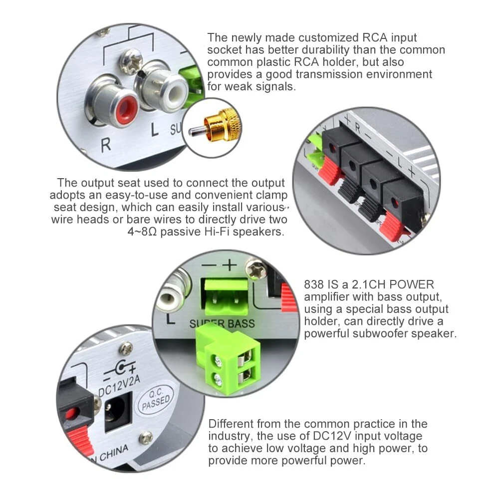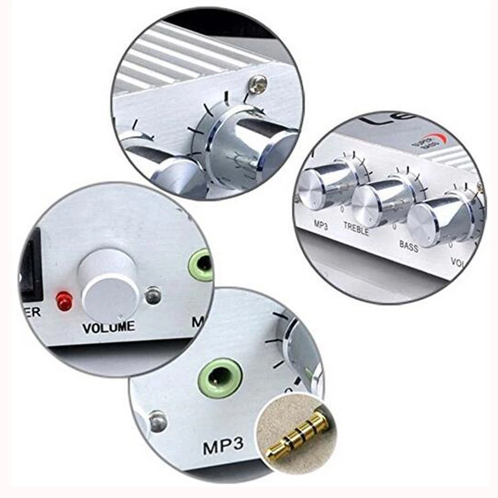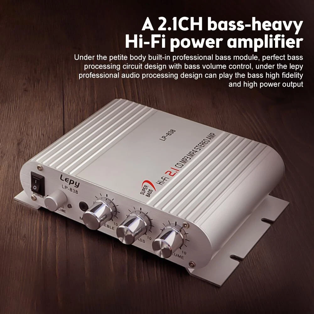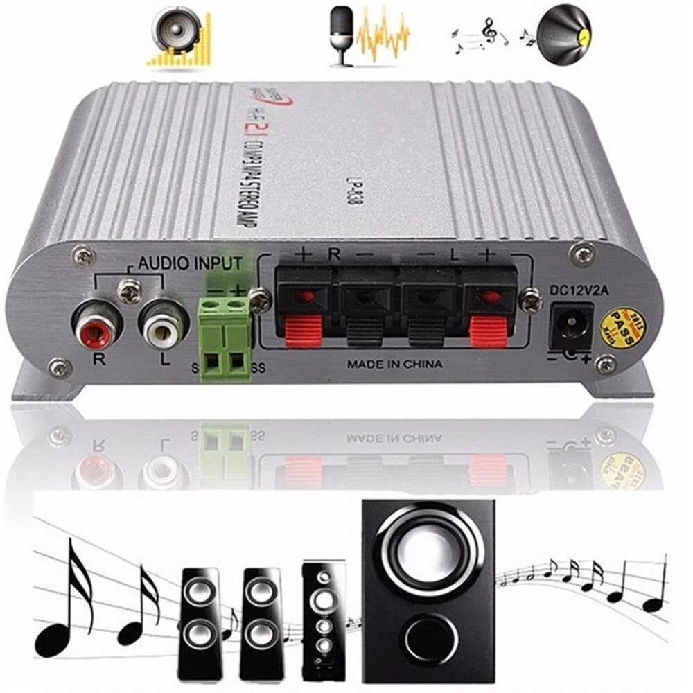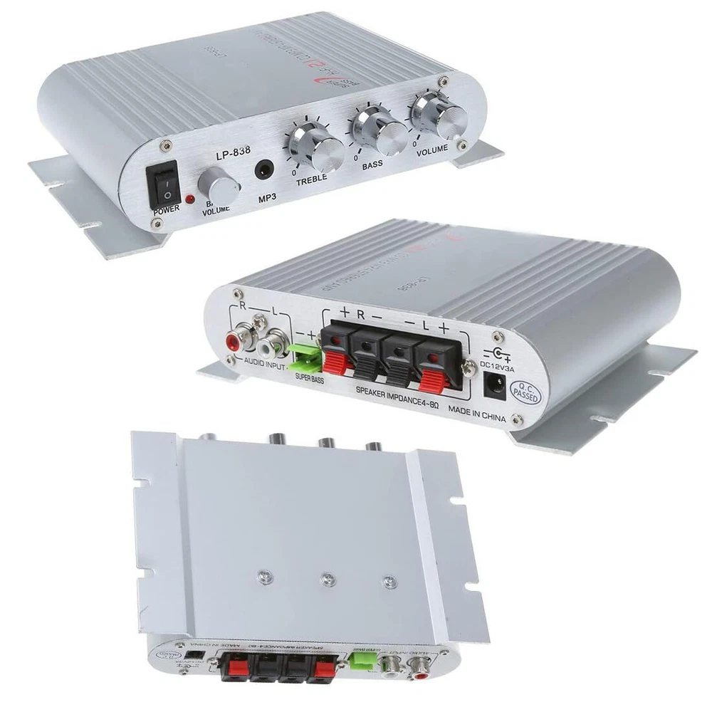 Item Description: If you have a radio, MP3 or other stereo system attached to your car or motorbike, get great sound on the move with this hi-fi amplifier which is also a great option for connection to your home theatre or entertainment system. Features: 1.MP3,for iPod, CD player input jack 2.20W max power output 3.Low distortion 4.Great for use on your vehicle or your home 5.Smart, lightweight aluminium casing 6.lightweight, has a matt silver casing and allows for full control of your volume, treble and bass output. It also has a jack for plugging your MP3, MP4,for iPod or CD player power amplifier, lepy power amplifier with high fidelity and high efficiency, high power amplifier, subwoofer compensation for public advertising, sofa background, massage chairs, furniture installation, modification, desktop computer and so on use value. Recommend the use of 12V5A DC power supply with the packing size: 4.6*10.5*15cm lightweight, has a matt silver casing and allows for full control of your volume, treble and bass output. It also has a jack for plugging your MP3, MP4,for iPod or CD player Three channels, provide a variety of options.Light weight, matte silver case, full control of volume, treble and bass output. It also has a jack for an MP3, MP4, i-Pod or CD player Mini car amplifier, save your car room and easy to operate.The Procut is not include Power cord, power adapter, power supply.