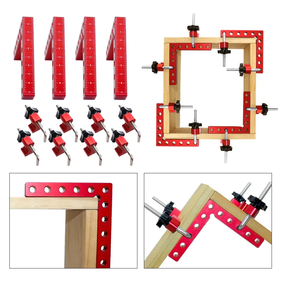 【Premium Material】Made of aluminium alloy, it will lasts for years. Anodized red surface, durable and resistant to corrosion, rust prevention. 【L-Type Design】L-Type positioning square, with accurate metric/inch scale and different fixing holes, is convenient for you to measure length, position, etc. 【Easy To Use】Beveled edges, Perfect 90° Corners, easy to handle and will not damage the fragile cutting edges, just place a square on the corner of the two stock pieces to square and secure with a set of clamps. Excellent ergonomic design for gripping power which can help to set up quickly, providing you a comfortable and safe using process. 【Wide Application】This Carpentry right angle jig set designed to be clamped to boxes, picture frames, drawers,frames, shelf cabinets, 90 degree weld and for outside corners. Practical DIY tool to make your woodworking project easier. 【What You Get】4* Positioning Squares and 8* Clamp Hooks