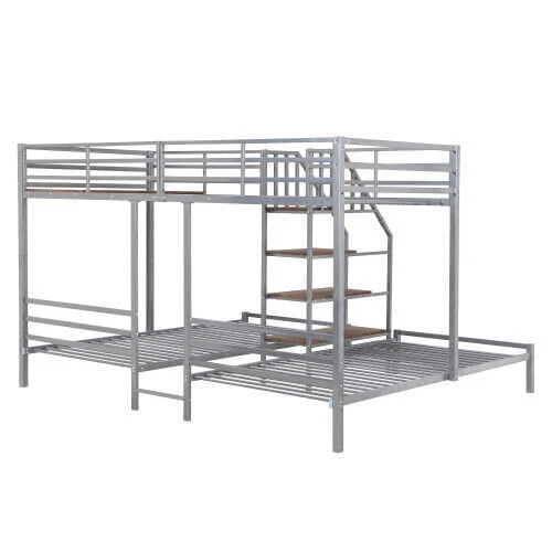 L-Shaped Triple Bunk Bed with Stairs, Metal Twin Over Twin & Twin Bunk Bed Features [Sturdy Metal Frame] Made of solid metal frame, the bunk bed is durable and reliable for you bedroom.Surrounding with high guardrail on upper bed, no need to worry about safety when sleep alone. [Space Saving Design] Three beds in one, while this bed provides a solution for multi-person accommodation, it also greatly saves space. [Multiple Storage Space] The 4-tier shelf is both a storage shelf and a staircase. The upper bed also comes with a 21.3" x 39" plank where you can put toys and more. Theres spacious space under the down beds. [No Box Spring Required] The slats support the mattresses not to slide and increase the service life. [Easy Assembly] All parts included in your package are indicated clearly. With step-by-step installation manual and per-drilled holes, you can easily assemble this bed individually. Manual installation is recommended. Description Metal Twin over Twin & Twin Bunk Bed, Triple Bunk Bed with Storage Shelves Staircase, Black This metal bunk bed features three beds in one, truly a space-saver. With a twin size bed on top and two twin size beds underneath, this bed is ideal for accommodating guests and sleepovers, and also perfect for family with multiple members. The staircase between beds is available for storage and the down bed is 10.4" off the floor, so there's spacious space under the down beds, you can use it to store your stuff. The top bed is equipped with full-length guardrail, keeping user's safe from falling. Coming with great quality and multiple function, this bed will be the best addition to your bedroom. Description Material Metal+MDF Size Twin Color Black Numbers of Package 2 Spring Box No need Assembly Required Yes Origin China Dimensions Overall Product Dimension 101.2''L x 77.4''W x 57.8''H Package Dimension Please refer to the Specification Upper Bed 76'' x 39'' Down Bed 75.2'' x 39.2'' Total Height 57.8'' Number of Bed Slats(Upper/Down) 22pcs/22pcs/22pcs Recommend Mattress Thickness of Bed(Upper/Down) 6''/8-10'' Overall Product Weight 180lb Bed Weight Capacity(Upper/Down) 300lb/300lb