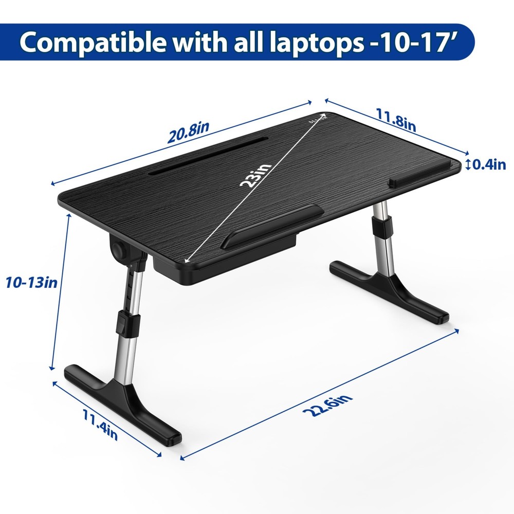 LT05 Adjustable Laptop Table, Portable Standing Bed Desk, Foldable Sofa Breakfast Tray, Notebook Computer Stand for Reading and Writing Height Adjustment Easy Adjustable 5 Height Positions from 9.4” to 12.6”. Pull up--Pull out the table footing to your desired height and it will be locked automatically without taking any further action. Pull down-- Press the lock button and press the table gently to the desired height, then release the lock button, it will be locked automatically. Angle Adjustable 0°-36° angle adjusting without a pause. Hold and press the two sides lock button at the same time, you can easily adjust the slope of desktop; adjust to the appropriate slope, then release the two side lock button to lock it down. Easy Carry and Storage Retractable legs could fold below the table for easy storage and carry. You could use it anywhere in your home or office. Anti-slip Baffles for laptop and mouse Laptop baffle could stop the laptop to be slided when you use the table in different angles during operation. Mouse baffle provides a comfortable support when you use it with mouse. Tablet Groove & Storage Drawer Built-in stand groove for supporting tablets and smart phones, and a storage drawer for pens and glasses. Specification: Size: 20.8”x11.8”x0.35” (530x300x9mm) Height Adjustment: 9.4” to 12.6” Tilt Angle: 0° to 36° Loading Weight: Up to 77 lbs (35kgs) Support: Up to 17” Laptop Wide compatibility & Tablet Groove & Storage Drawer: LT05 Laptop table is 20.8”x11.8”x0.35” (530x300x9mm) of size which fits for 17” or larger laptop with space for a mouse. Built-in stand groove for supporting tablets and smart phones, and a storage drawer for pens and glasses. Multiple Uses: This multifunctional table will be a perfect addition to your office or home. You could use it on bed, couch/sofa, desktop and floor. A snack tray for watching TV, a laptop stand for relaxing in bed or a standing table for office or home work. Angle Adjustable: 0°-36° angle adjusting without a pause. Hold and press the two sides lock button at the same time, you can easily adjust the slope of desktop; adjust to the appropriate slope, then release the two side lock button to lock it down. Height Adjustable: Easy Adjustable 5 Height Positions from 9.4” to 12.6”. Simply press the lock button and pull the table leg gently to the desired height. Then release the lock button, it will be locked automatically. Portable: Retractable legs could fold below the table for easy storage and carry. You could use it anywhere in your home or office.