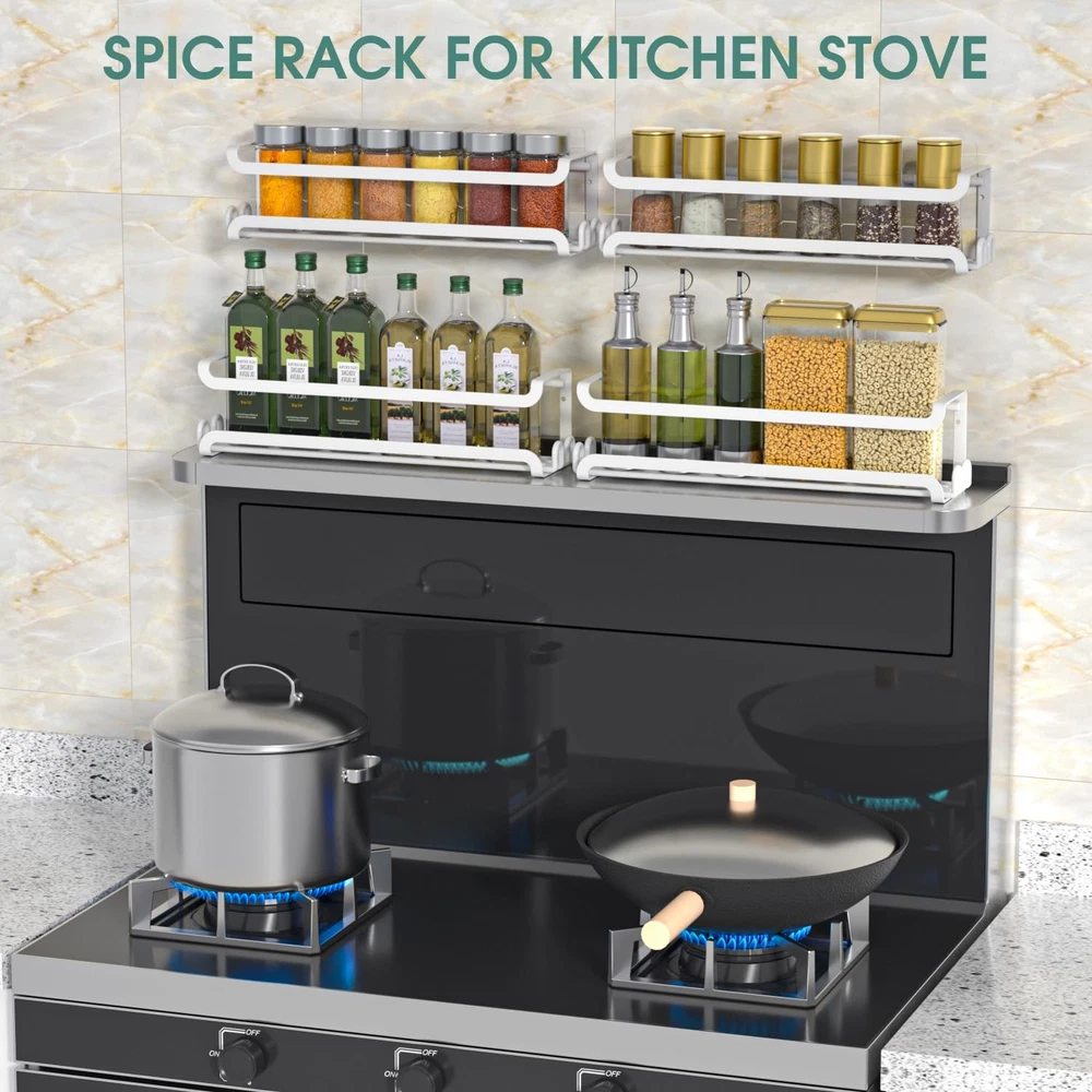 Premium spice rack cabinet door spice rack set is stylish and fits any decor in your kitchen or pantry. Made of sturdy iron with a finish, it's durable and keeps your space sleek and organized. Stable Guardrail & Wider Adhesive Stickers - Our spice rack organizer for cabinet door added side guards and improved two-in-one wider adhesive stickers for increased safety and stability. The adhesive spice racks have guard rails prevent spice from falling, while the wider and stronger stickers provide extra protection and peace of mind in your busy kitchen Sturdy Spice Rack with 16 Hooks - The premium metal cabinet door spice rack is meticulously crafted with powder-coating for enhanced durability and rust resistance. The pantry door spice rack organizer comes with 2 hooks on both sides(4 pack total 16 hooks), so you can easily hang bottle openers, scissors and some other light items.Purpose-built to ensure practicality, versatility, and strength, our wall mount spice rack for cabinet door can be safely used in domestic and commercial spaces Two-Installation Options - Our spice rack organizer for cabinet door has two installation methods: punch-free and perforated, free choice, convenient and quick. Wall mount spice rack Equipped with two different sizes of screws, which can be firmly fixed on the wall (thin doors/hollow doors are not recommended); the cabinet spice organization are also strong adhesive stickers that provide a drill-free suspension solution, which is easy Install without damaging the wall or door(best for flat surfaces) Ideally Sized Spice Organizer - 2.36x2.75x12 inch, Each hanging spice rack shelf provides space for regular sized spice jars (up to 2" ). The cabinet door spice rack organizer has closed sides to keep glass spice jars from falling out either end. Keep your seasoning perfectly organized with the wall mount spice rack & enjoy easy access at all times Hang Just About Anywhere - The small spice rack organizer for cabinet door can be mounted on your wall, inside your stove or pantry/cabinet door, bathroom, or RV. Experience the choice according to your needs with these space-saving wall mount spice rack. The cabinet door spice organization features a straight forward and functional design that can easily complement any space