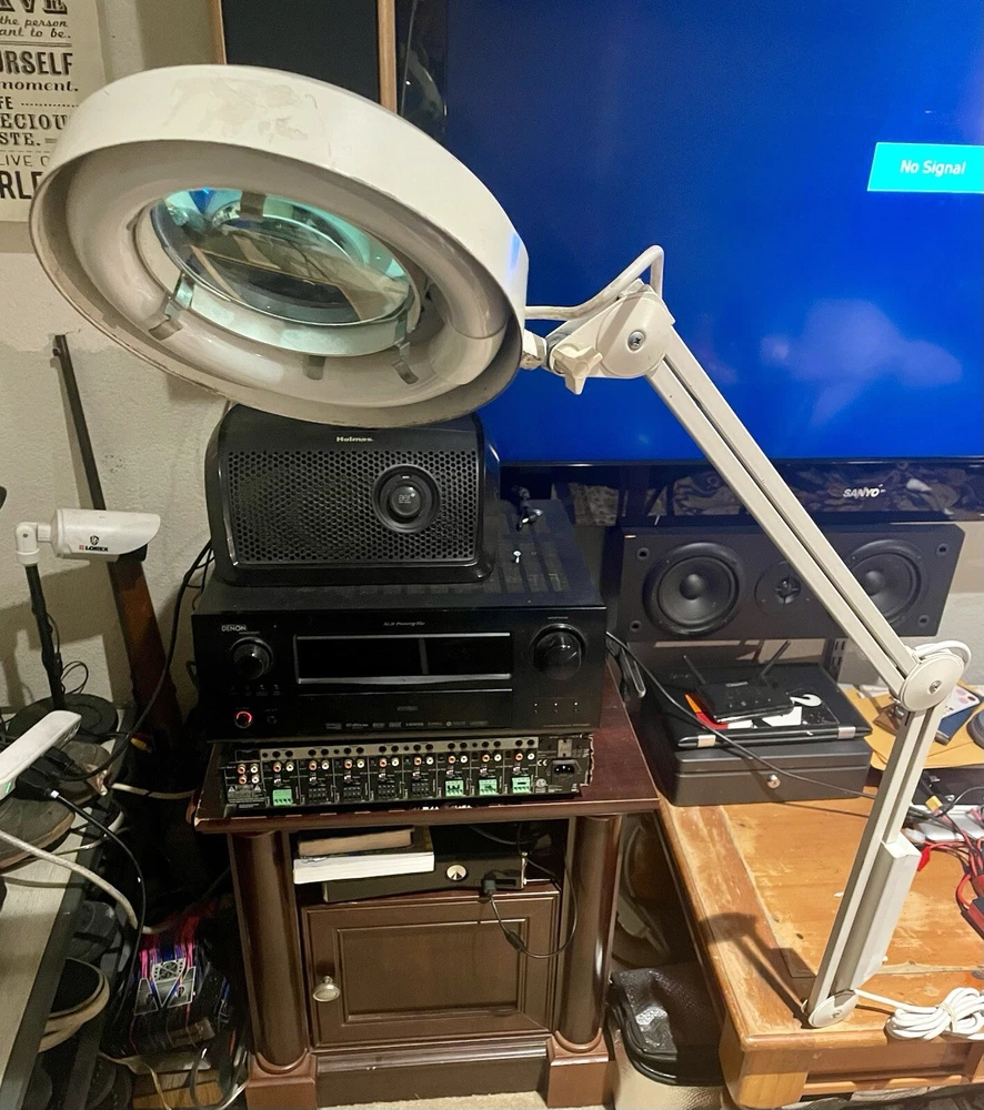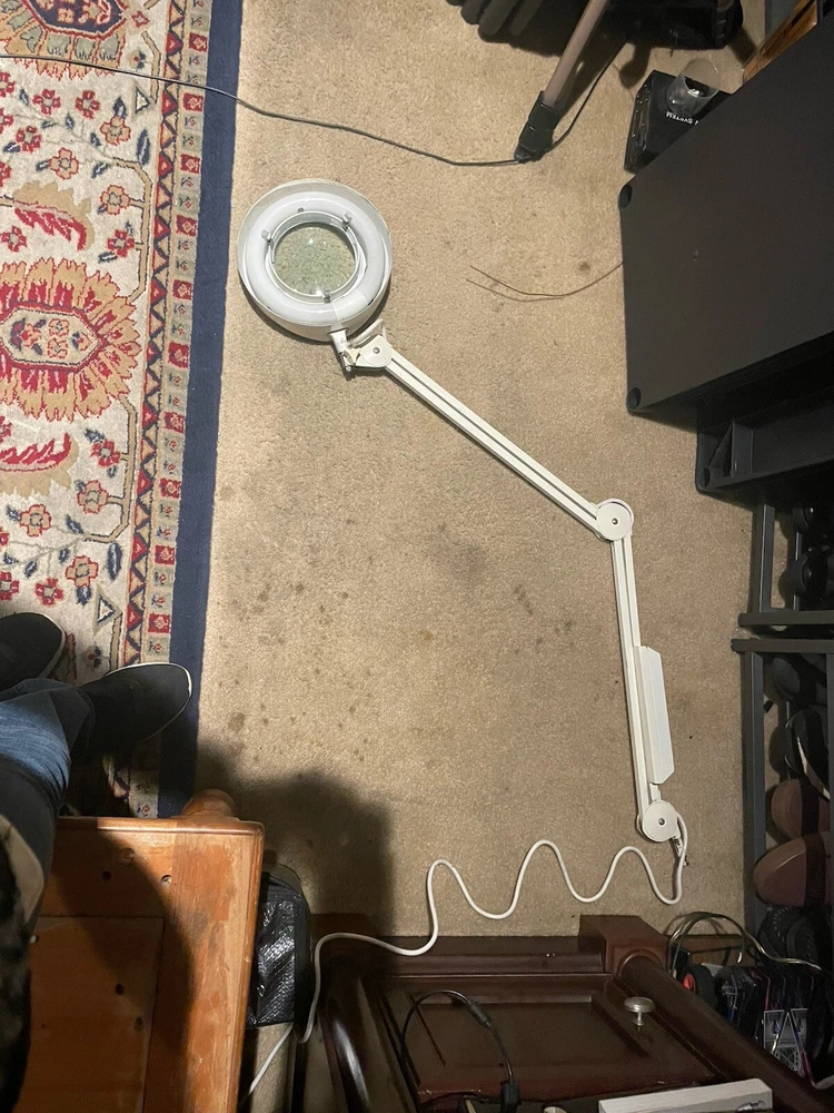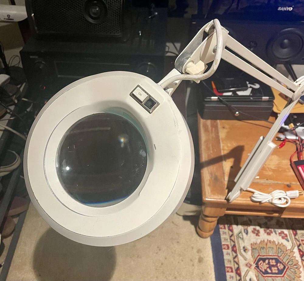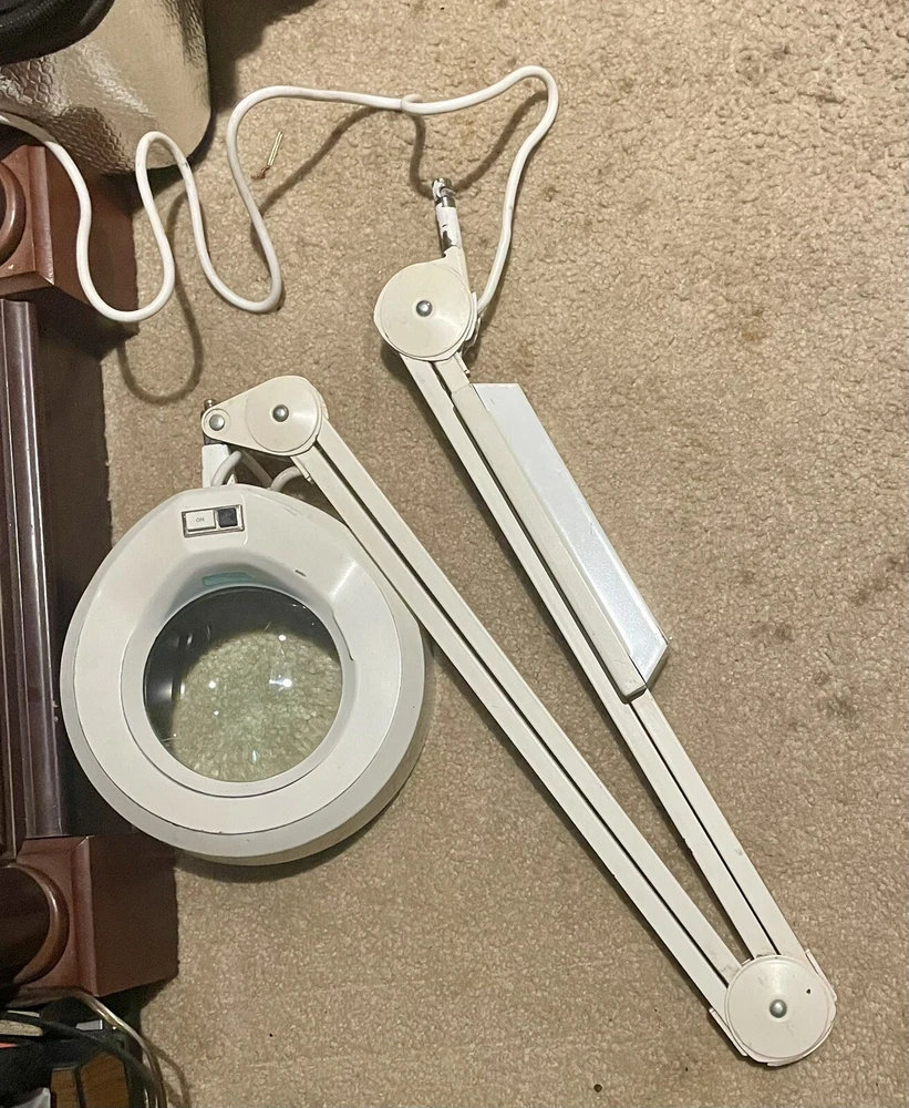 Illuminate your workspace with the Luxo Magnifier Lamp, a vintage workhorse designed to provide exceptional lighting for intricate tasks. With its articulating arm, this industrial lamp can be easily adjusted to focus light where you need it, whether you're repairing jewelry, drafting, or engaging in any detail-oriented activity. The lamp's large size, standing up to 45 inches extended, ensures a comfortable and efficient work environment. Crafted in the United States, the lamp showcases a mid-century industrial design, complete with a robust metal construction and a matte white finish that easily integrates into various settings. The round shade and flexible clip-on features make it an ideal addition for both professional workshops and home offices. This original Luxo piece, complete with a push-button control and a fluorescent tube lighting source, offers a timeless aesthetic and functionality. Luxo Vintage Magnifier Lamp is used, everything is working. Does not have clamp. Sold as is.