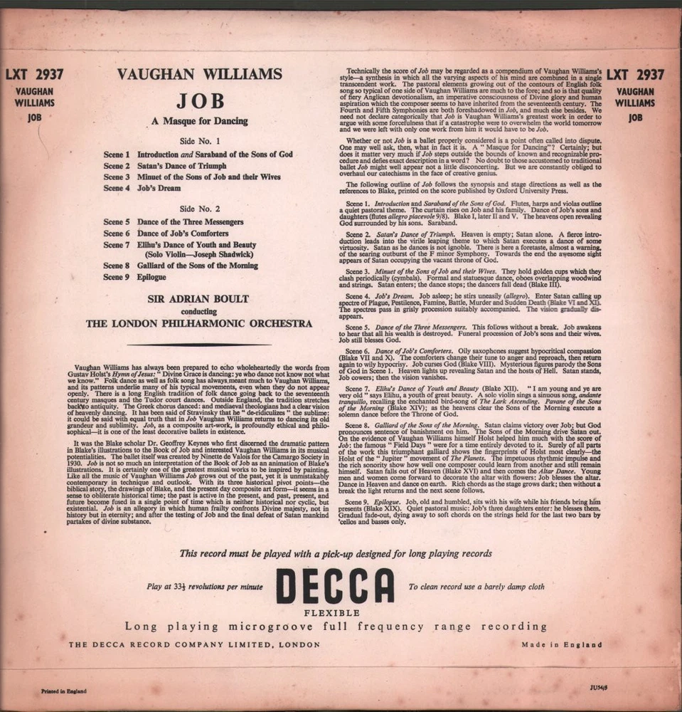 GRADING Our Grading System The table below is an overview of how our grading system works. The first grade is for the sleeve and second grade is for the media/disc, e.g. VG+/EX means that the item's sleeve is in Very Good Plus condition and the media/disc is in Excellent condition. If there is only one condition, e.g. /EX, it means that the item is not in a picture sleeve and that the media/disc is in excellent condition. Records that aren't in picture sleeves will either be in a company sleeve or a generic plain sleeve. If you have any questions, please get in touch. Condition Sleeve Media MINT (10/10) Mint, perfect Mint, perfect EX+ (9/10) Excellent plus, near mint Excellent plus, near perfect EX (8/10) Excellent, well looked after, clean, only slight signs of use Excellent, well looked after, clean, only slight signs of use EX- (7/10) Excellent minus, light wear and signs of use Excellent minus, light wear and signs of use VG+ (6/10) Very good plus, some moderate wear Very good plus, some scuffs, no deep marks VG (5/10) Very good, well used and worn Very good, well used and marked VG- (4/10) Very good minus, very worn Very good minus, very worn and marked GOOD (3/10) Good, some major wear Good, some major wear and scuffing FAIR (2/10) Fair, major wear Fair, major wear and scuffing POOR (1/10) Poor, severe wear Poor, severe wear and scuffing DELIVERY Combined Postage If you add all the items you wish to purchase from us to your shopping basket/cart, and then go to the checkout page from the shopping basket page, the shipping cost will be automatically combined. Packaging All of our items are parcelled using strong specially designed packaging, each vinyl in an order is placed in a clear plastic sleeve and plain paper white sleeve, and is separated from its cover (unless it is advertised as sealed), to prevent any damage during transit. If an item is sealed, and you would prefer the vinyl to be placed outside of its sleeve before dispatch, please let us know. Prices You can see all delivery options and prices for an item on the "Postage and payments" tab. Tracked delivery If you wish to have a tracking number with your order, please select the "Signed" or "Express" delivery option, "Standard" delivery does not include a tracking number. SHOP Click here to view our Ebay shop, with over 200,000 items in stock FAQ What is a "test pressing"? Test pressings are the first copies of a disc made at the pressing plant in order to verify the disc plays cleanly and correctly before mass producing it. They are usually only pressed in minimal quantities, often making them very rare. Does a used item include the original inner sleeve/insert/poster etc.? We will always include in the description if a used item includes any additional parts, e.g. "with inner" or "includes poster", if you know an item originally came with any additional parts, such as a printed inner sleeve, and it isn't mentioned in the description, then generally the used item won't include it, but please feel free to ask. New items will always be complete, unless otherwise specified. CATEGORIES Shop Home 10" Vinyl Records 12" Vinyl Records 7" Vinyl Records Cassettes (Tape) CDs (Compact Discs) LP Vinyl Records Music Memorabilia Other Artist Sir Adrian Boult / London Philharmonic Orchestra Title Vaughan Williams - Job (A Masque For Dancing) Format LP Vinyl Country UK Label Decca Catalogue Number LXT2937 Year 1954 Description 9 track mono test pressing issued over 2 separate single sided discs with hand written notes on labels - sleeve has damp-spotting and creases Condition (Sleeve/Disc) VG+/VG+ Track List Job (A Masque For Dancing) - A1. Introduction And Saraband Of The Sons Of God - A2. Satan's Dance Of Triumph - A3. Minuet Of The Sons Of Job And Their Wives - A4. Job's Dream - A5. Dance Of The Three Messengers - B1. Dance Of Job's Comforters - B2. Elihu's Dance Of Youth And Beauty - B3. Galliard Of The Sons Of The Morning - B4. Epilogue DELIVERY INFORMATION If you wish to have a tracking number with your order, please choose the Signed or Express delivery option, the Standard delivery option does not include a tracking number. Please note, the Express option for delivery outside of the UK includes a tracking number, but has the same delivery time as the Standard option. WE HAVE MORE SIR ADRIAN BOULT / LONDON PHILHARMONIC ORCHESTRA ITEMS IN STOCK We have more items in stock by this artist, click here to see them. ABOUT US Vinyl Tap has been in the business of selling music for over 30 years, and in that period we have supplied many thousands of collectors and music fans around the globe with vinyl, CDs and music memorabilia. You can check out the over 200,000 items that we have in stock on our Ebay shop, here . Artist: Sir Adrian Boult / London Philharmonic Orchestra - Title: Vaughan Williams - Job (A Masque For Dancing) - Format: LP Vinyl - Country: UK - Label: Decca - Catalogue Number: LXT2937 - Year: 1954 - Description: 9 track mono test pressing issued over 2 separate single sided discs with hand written notes on labels - sleeve has damp-spotting and creases
