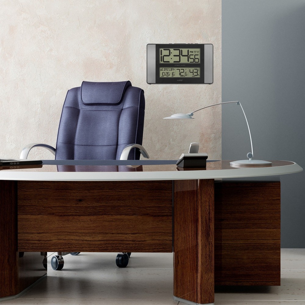 11 Inch wide atomic digital wall clock displays time, calendar, with the current room temperature and humidity. Clock self-sets to the most accurate time or switch atomic time off (out of WWVB range) and manually set to your current local time. Adjustable display in English or Spanish and viewable in Fahrenheit or Celsius. Monitors indoor humidity with HIGH/LOW records and features a time alarm with 10 minute snooze. Optional to hang onto wall or table stand. Requires 2 AA (not included) alkaline batteries to operate.Indoor-Outdoor: Indoor OnlyNumber Type: Arabic-StandardType: Atomic, DigitalProduct Features: Alarm, Day-Date DisplayMaterial: Plastic, MetalFeature: WirelessColor: Silver Free Shipping Over $49.99* Details La Crosse Technology 513-1417H-AL Atomic Digital Clock with Indoor temperature & Product Description: 11 Inch wide atomic digital wall clock displays time, calendar, with the current room temperature and humidity. Clock self-sets to the most accurate time or switch atomic time off (out of WWVB range) and manually set to your current local time. Adjustable display in English or Spanish and viewable in Fahrenheit or Celsius. Monitors indoor humidity with HIGH/LOW records and features a time alarm with 10 minute snooze. Optional to hang onto wall or table stand. Requires 2 AA (not included) alkaline batteries to operate. Indoor-OutdoorIndoor Only Number TypeArabic-Standard TypeAtomic, Digital Product FeaturesAlarm, Day-Date Display MaterialPlastic, Metal FeatureWireless ColorSilver