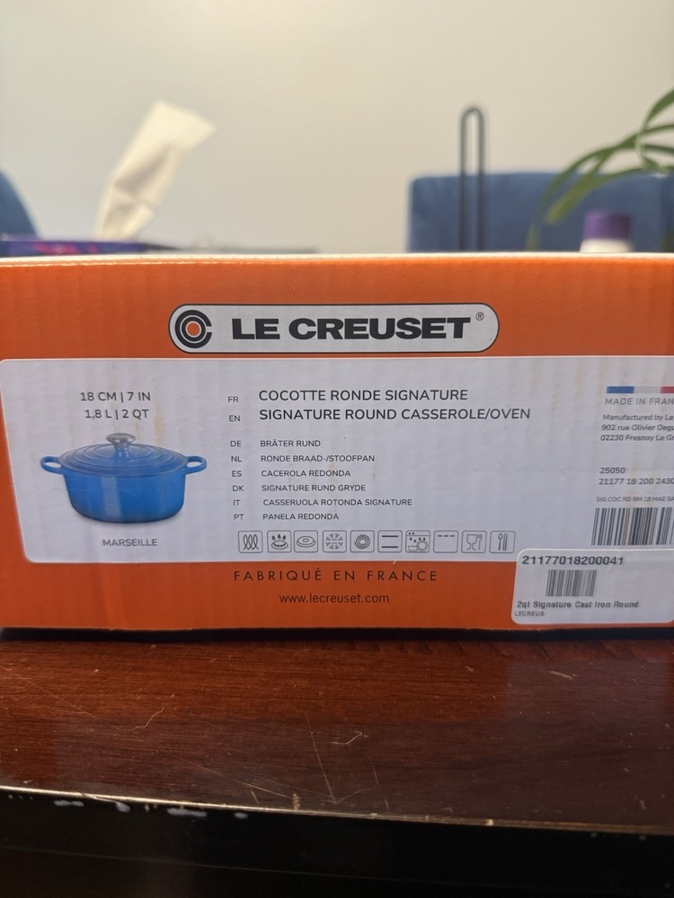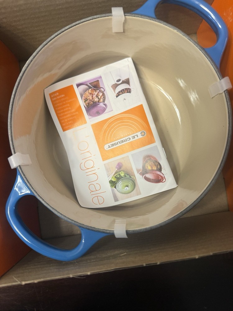 **NEW never used, in its original box**. The La Crueset 2.0 QT Cocette Dutch Oven in Marseilles (blue) is a high-quality kitchen essential that is perfect for cooking on any stove type - induction, electric, or gas. Made of durable cast iron with a ceramic surface coating, this Dutch oven offers excellent heat resistance up to 500°F. With a stylish round shape and a capacity of 2 quarts, it comes in a two-piece set that includes a lid, making it easy to use and clean. Backed by a lifetime warranty, this Dutch oven is a reliable and versatile option for home cooks looking for a reliable and long-lasting cookware piece.