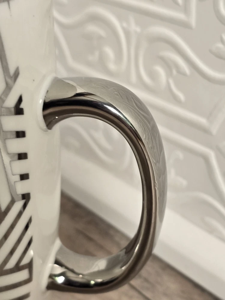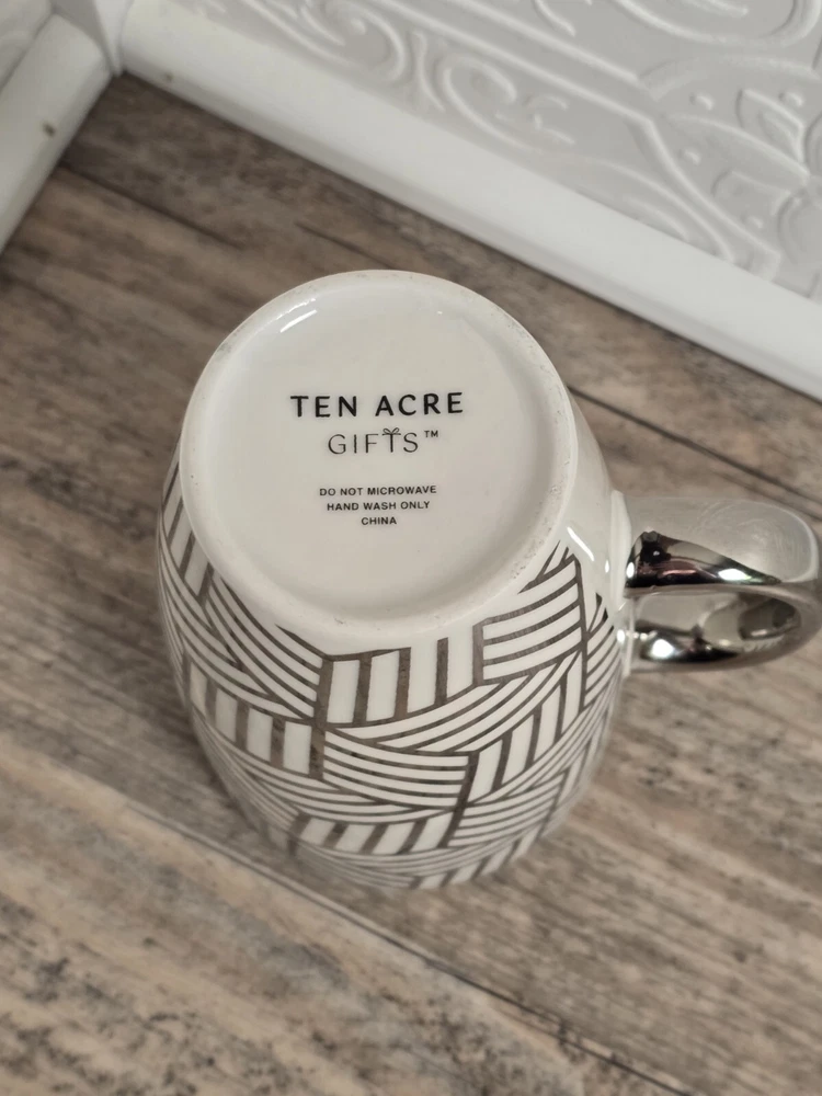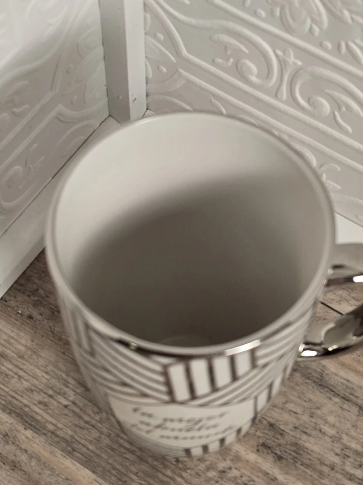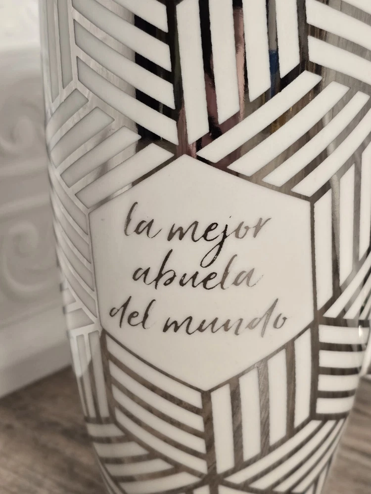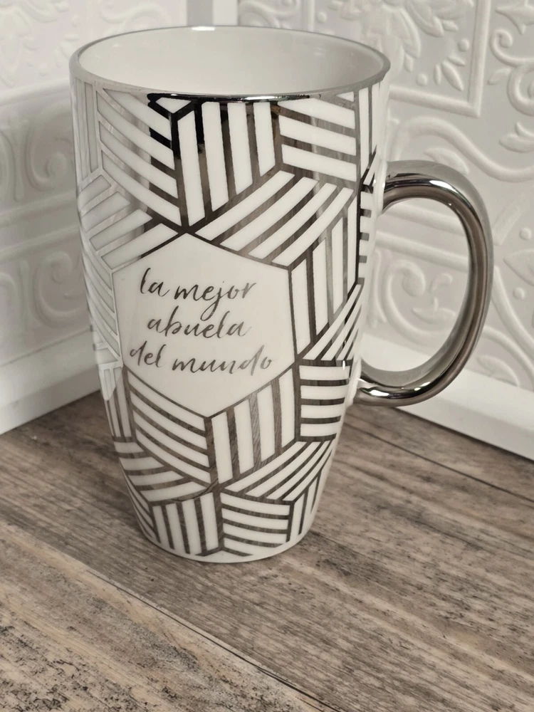 BEST GRANDMA IN THE WORLD or La Mejor Abuela del Mundo! This mug is gorgeous with it's metallic geometric design that carries over to the handle. Unfortunately, you cannot use this in the microwave. Mother's day is coming and this would make a wonderful gift for grams! IT measures 6 inches tall and 3.5 inches in diameter. Reach out with questions.