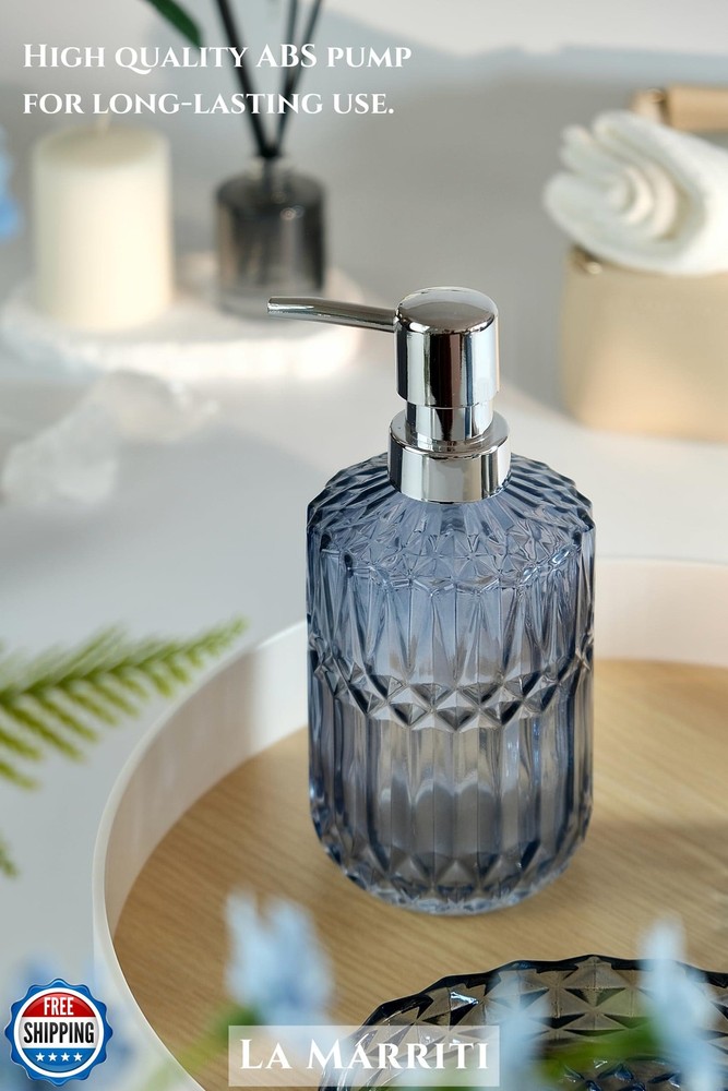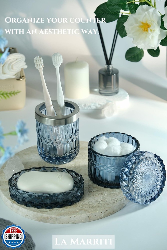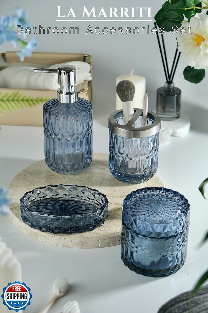 LaMarriti Blue Bathroom Accessories Set, 4Pcs Clear Glass Bathroom Accessories, Bathroom Hand Soap Dispenser Set, Soap Dish, Toothbrush Holder Set, Vanity Bathroom Decor, Gift Set Features 【Create a Coastal Oasis with Navy Blue & Brass Accents】Inspired by coastal design, this 5-piece bathroom set combines serene navy blue glass with brass-tone pumps, transforming your vanity into a beachside retreat. Perfect for modern, nautical, or master bathroom decor 【Maximize Vanity Storage & Organization】The bathroom cup set declutters bathroom essentials effortlessly. Use the toothbrush holder for razors or makeup brushes, the soap dish for jewelry, and the jar for cotton pads—ideal as a restroom organizer for small spaces 【Premium Quality】Crafted with 6mm-thick ocean-blue lead-free glass, these bathroom organizers resist cracks and daily wear—no chipping ceramic edges or yellowing plastic. The weighted base prevents tipping on cluttered vanity counters, while the brass-tone ABS withstands humid environments without rusting 【Easy to Clean】No more stubborn water spots or soap scum! The smooth glass surface repels toothpaste splatters and makeup stains – simply rinse with water or wipe with a damp cloth (no scrubbing needed!). Resists yellowing and grime, even in steamy bathrooms. Less cleaning time, more spa time 【Thoughtful Gift for Home Lovers】The soap and toothbrush holder set arrives in a gift-ready box, perfect for New Year gift, housewarmings, weddings, birthdays, Christmas, or any occasion. Blending practical storage with stylish decor, it’s a present they’ll use daily 【Notice】 1. The metal holder for the toothbrush holder is securely tucked into the top foam layer, rather than being lost. Please check the top layer of the foam for it. 2. The color of the glass may vary under different lighting conditions. The more abundant the light, the more translucent the glass will appear. Enjoy the unique beauty of your glass product under various lighting to fully appreciate its charm Shipping Free & Fast Shipping: We offer free shipping to most of the USA with a normal delivery time of 3-7 days. However, due to the current situation, additional delivery time (up to 3 weeks) may be required for some items. Alternative Carriers: We may use alternative carriers (e.g., USPS, FedEx, UPS) to ensure your package arrives safely and on time. Due to the use of multiple carriers, we are unable to provide a tracking number automatically. Handling Time: Orders are processed and shipped within 1-2 business days of receiving cleared payment. Shipping Restrictions: Shipping to Alaska, Hawaii, Puerto Rico, Guam, and other US territories may incur shipping charges or delivery restrictions. Please contact us before ordering, or your order can be refunded/cancelled. State Restrictions: Certain items may not be shipped to California due to state regulations. Contact for Tracking Updates: If you require tracking updates or have any concerns about the delivery of your order, please feel free to contact us, and we will be happy to assist you. Return Policy 30-Day Hassle-Free Returns: If you are not completely satisfied with your purchase, you can return the item for free within 30 days of receiving it for a full refund or exchange. Easy Return Process: Contact us, and we will provide you with a prepaid return shipping label and detailed instructions. No Restocking Fee: There are no restocking fees for returns. However, the buyer is responsible for return shipping costs if the return is not due to a seller"s error. Refund Processing: Refunds will be processed within 1 business day of receiving the returned item in its original condition. Feedback Your feedback is extremely important to us. We strive to provide the best products and customer service possible. If you are satisfied with your purchase, please take a moment to leave us a positive review. If you have any concerns or issues with your order, please contact us before leaving negative feedback. We are committed to resolving any problems and ensuring your satisfaction. Contact Us If you have any questions or concerns, please feel free to reach out to our customer support team. You can contact us through the eBay messaging system. We are available Monday to Friday, 9:00 am to 5:00 pm EST, and we will do our best to respond to your inquiry within 24 hours. Thank you for supporting our small family business!