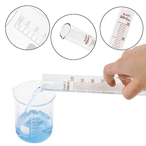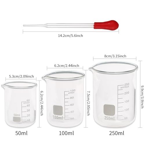 Laboratory Grade Borosilicate Glassware Set Discover the perfect glassware set for all your experimental needs, crafted from high-quality 3.3 borosilicate glass (GG-17) for durability and precision. Package Contains: Glass Cylinders in 4 Sizes: 10ml, 25ml, 50ml, 100ml Glass Beakers in 3 Sizes: 50ml, 100ml, 250ml 2 Glass Droppers Product Features: Made of thick, acid and alkali resistant glass for excellent stability. Graduated for precise measurements with clear and easy-to-read scales. Tapered gates on both cylinders and beakers ensure easy liquid pouring. Stable base on graduated cylinders for secure handling. Benefits: Packed in thick EPE and carton to prevent damage during transportation. A wide range of sizes to suit various experimental needs. Easy to clean, ensuring hassle-free maintenance. This glassware set is the ideal gift for experimenters and is perfect for school projects, home labs, Halloween theme parties, or science-themed birthday parties. Enhance your experiments with reliable and professional-grade tools!