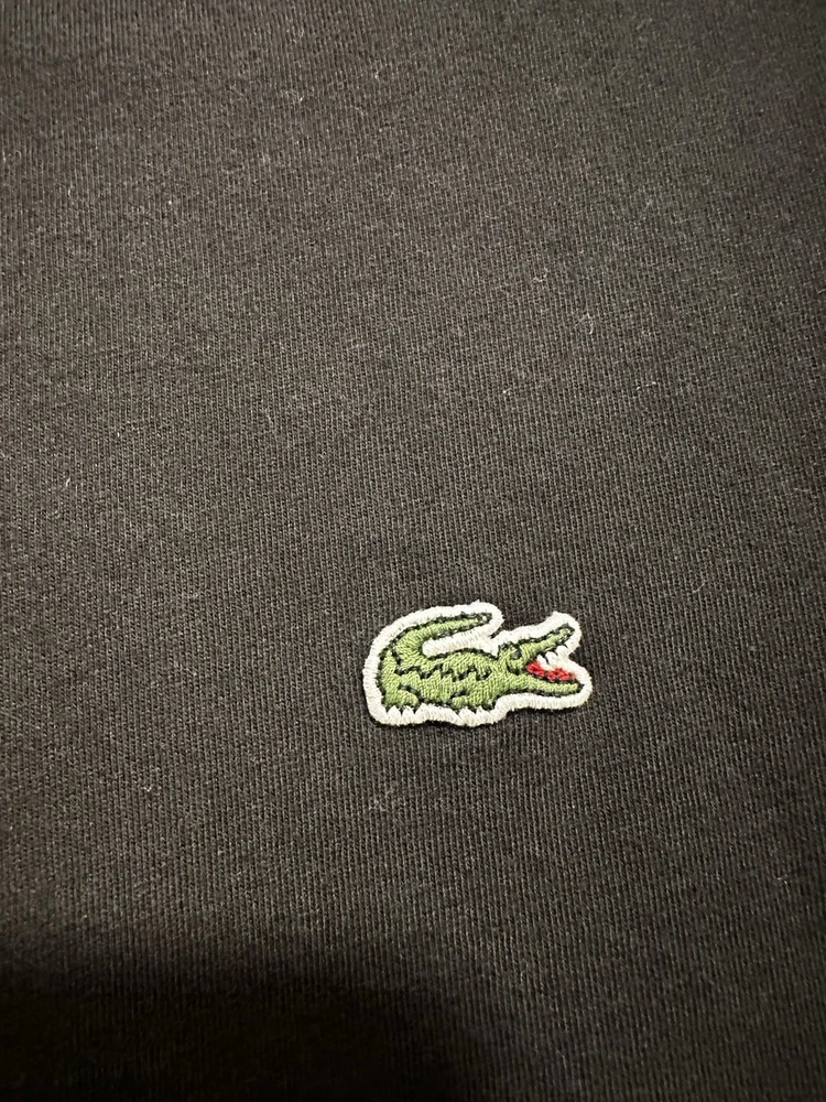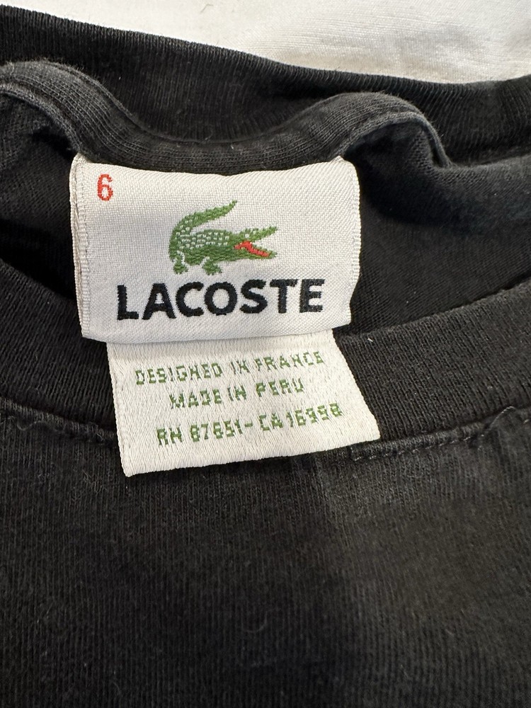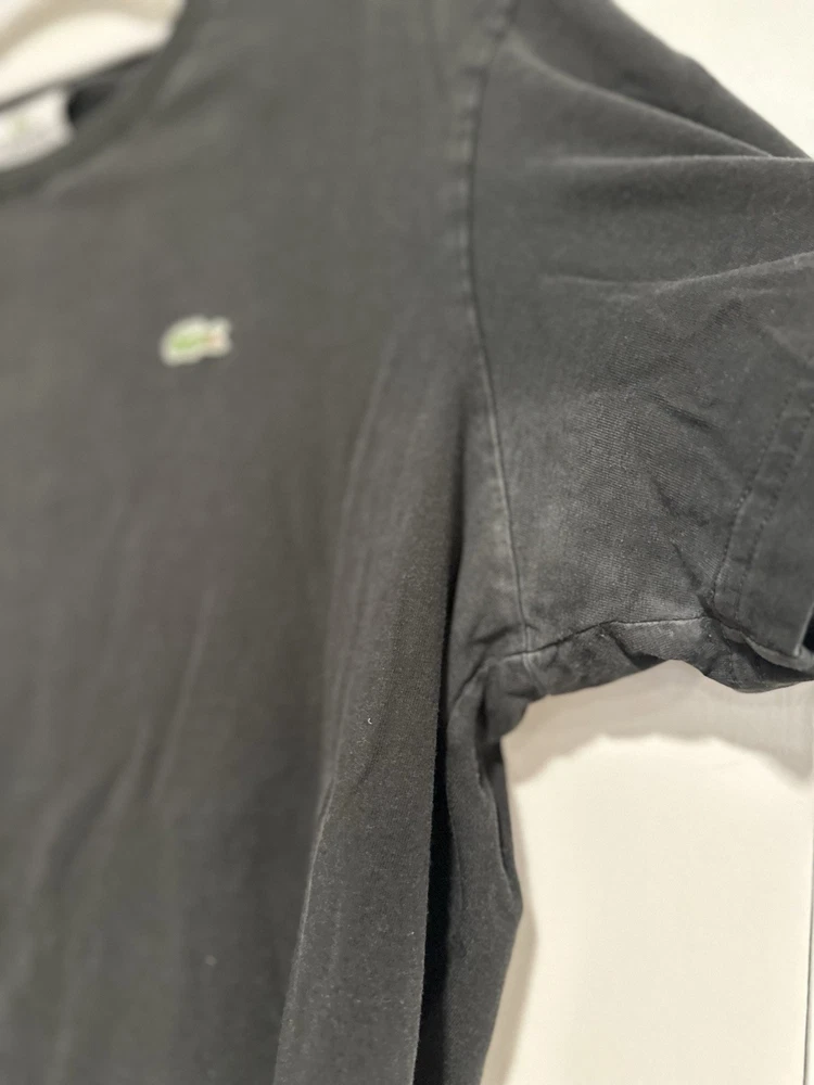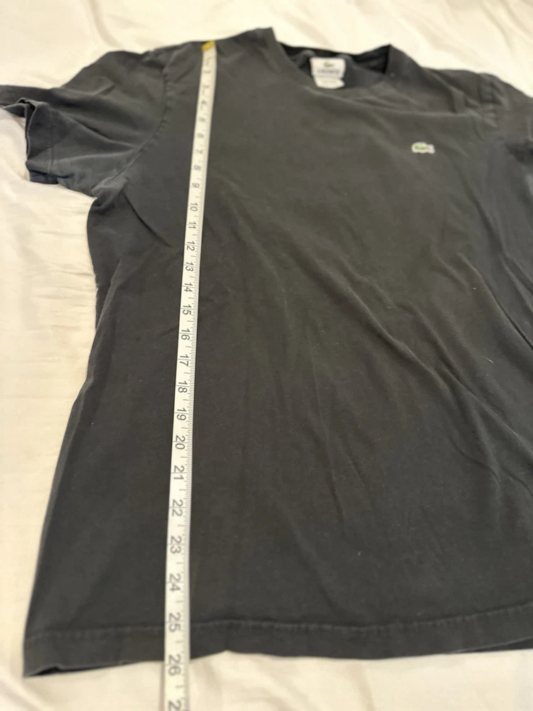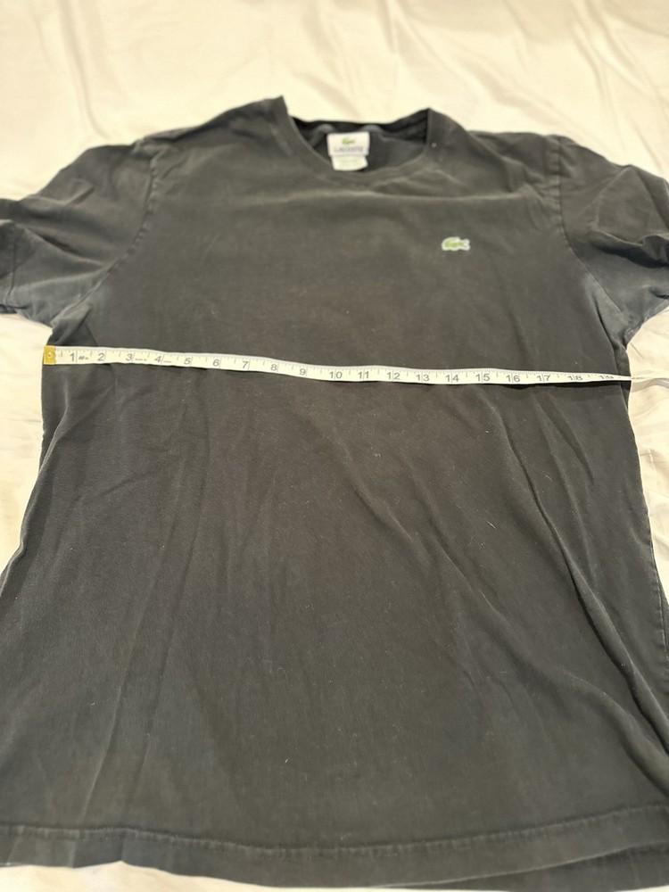Lacoste Mens Crew Neck T Shirt Plain Black Size 6 Short Sleeve Logo Cotton. Some fade. Some discoloration in the armpits noted in the photos. No rips or stains. Please see pictures for measurements.
