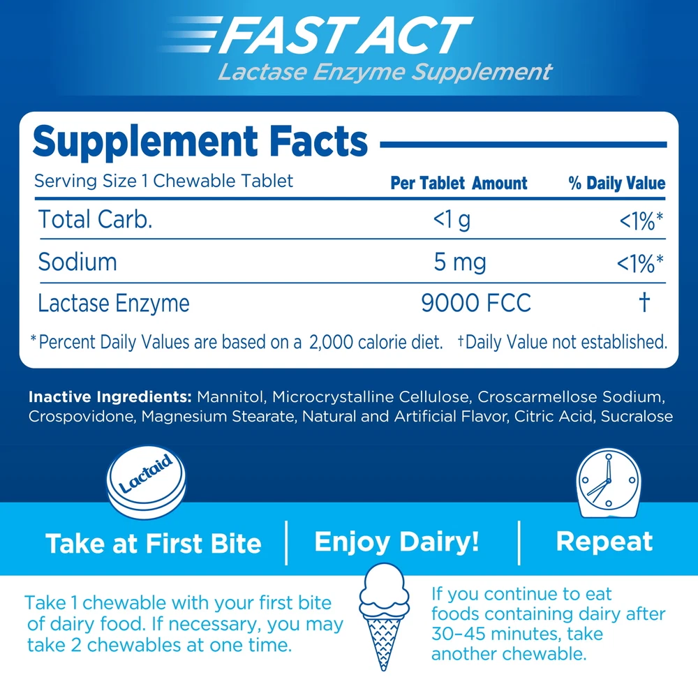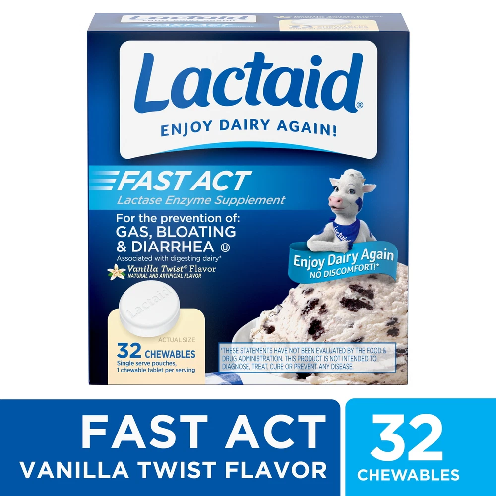 Lactaid Fast Act Chewables with natural lactase enzyme come in a Vanilla Twist flavor and work quickly to make dairy foods easy to digest for those with lactose intolerance or dairy sensitivity, so you can enjoy everything on your plate. This digestive supplement helps prevent the gas, bloating, and diarrhea that many people experience after eating foods containing dairy. The lactase enzymes in this dietary supplement contain 9000 FCC lactase units to help prevent symptoms associated with lactose intolerance by breaking down milk sugar (lactose), so dairy foods are easier to digest. These tasty chewables feature a smooth Vanilla Twist flavor and start working with your first bite or sip of dairy food. Certified kosher and suitable for ages 4 and up, Lactaid Fast Act Chewables are available in convenient, individually-wrapped packs making them easily portable for on-the-go dairy relief anywhere, anytime. Single-dose on-the-go packs of Lactaid Fast Act Lactose Intolerance Chewables, Vanilla Twist Dietary supplement to prevent gas, bloating and diarrhea associated with lactose intolerance Fast-acting formula makes dairy easy to digest by those with dairy sensitivity due to lactose Formulated with natural lactase enzymes, they break down milk sugar to help reduce discomfort Chewable tablets feature a Vanilla Twist Flavor and are suitable for adults and children, ages 4+ Certified Kosher and formulated with 9000 FCC lactase units per chewable Available in convenient, individually wrapped packaging for travel and on-the-go-dairy relief The fast-acting caplets start working with your first bite, so you can enjoy dairy with confidence
