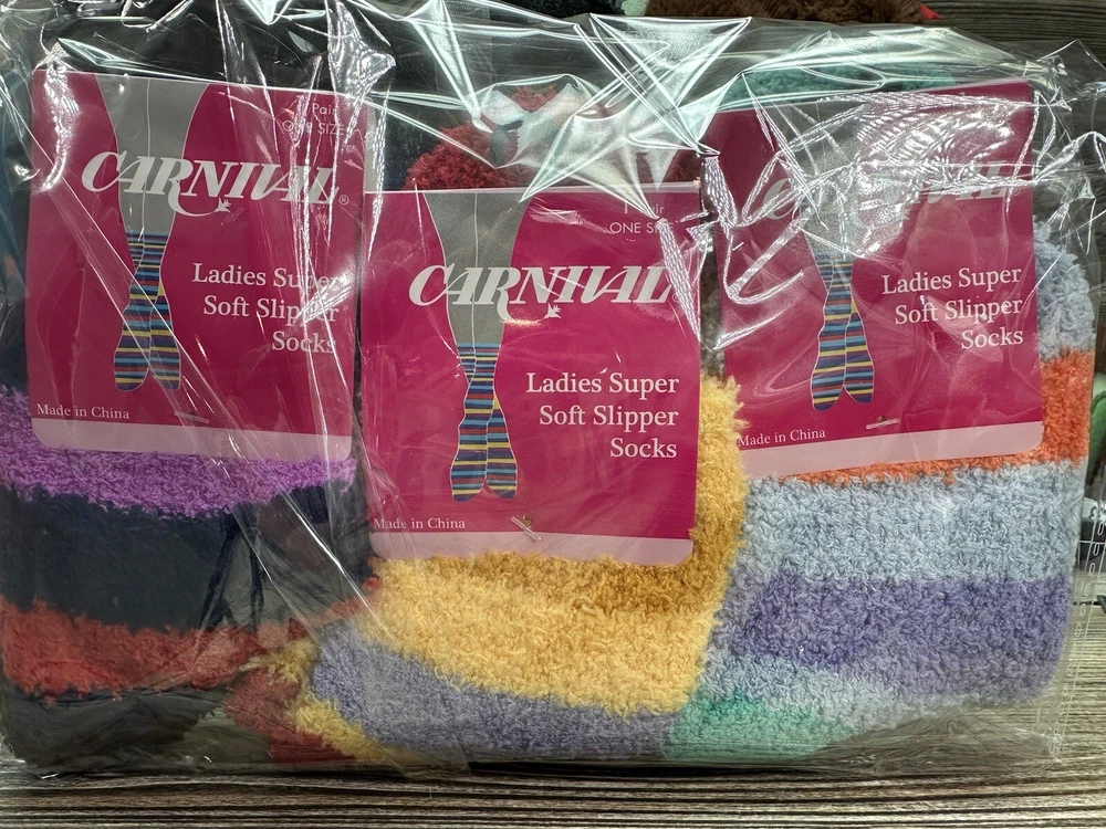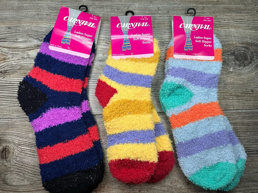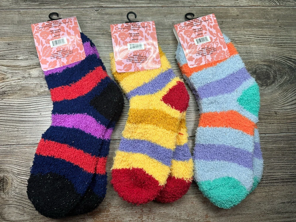 Character: Colorful Type: Socks Character Family: Stripes Department: Women Handmade: No Brand: Ladies Personalize: No Sock Length: mixed Pattern: Striped Style: Fuzzy Socks Size: One Size Color: Multicolor Material: Polyester Features: Fuzzy Theme: Colorful, Fun Number in Pack: 3 Pairs Season: All Seasons