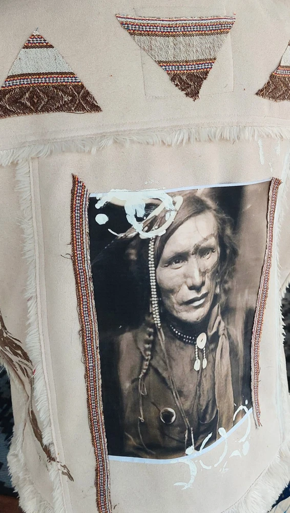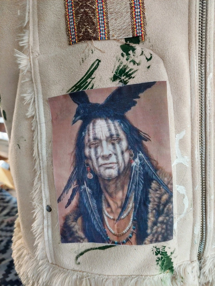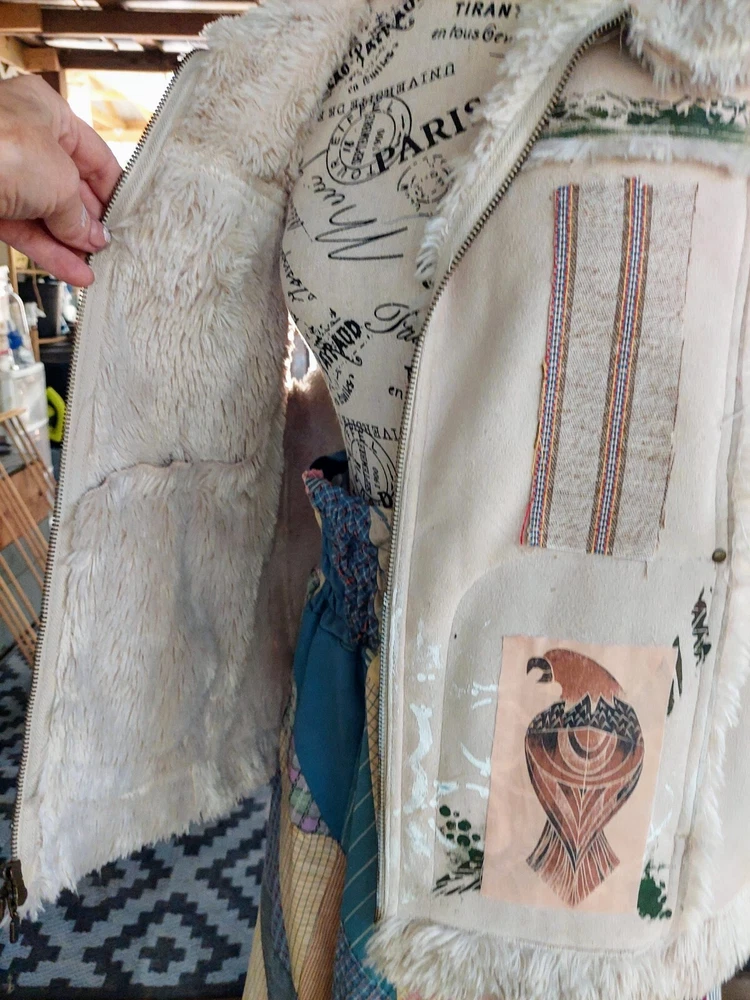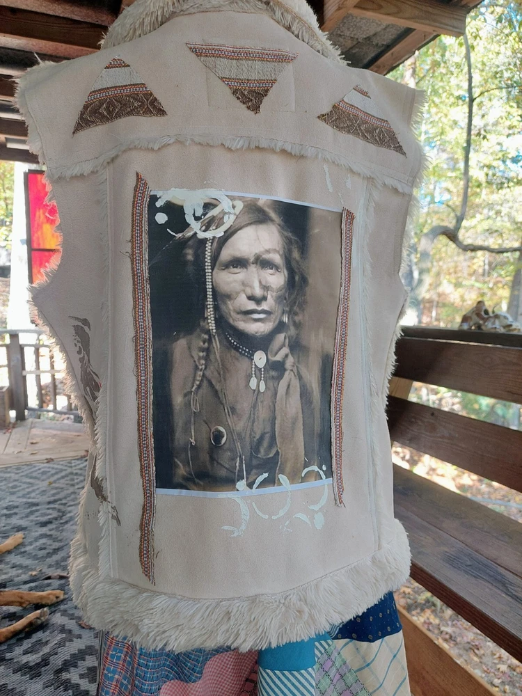 Faux Sherpa White Vest Wearable Art by Tennessee Rags Canvas, paint and appliques Bust 44"