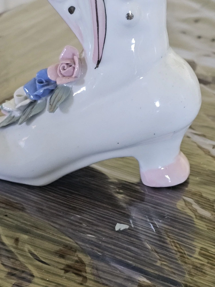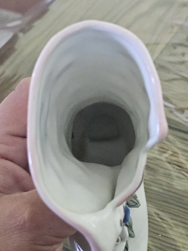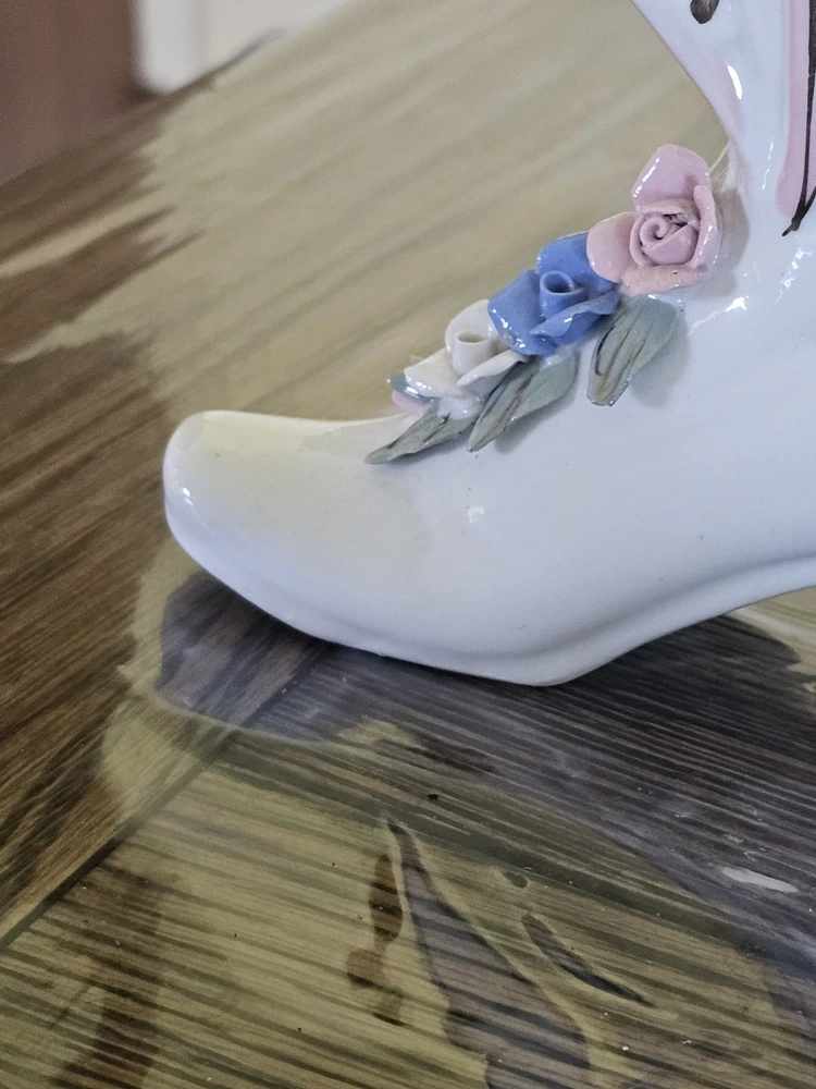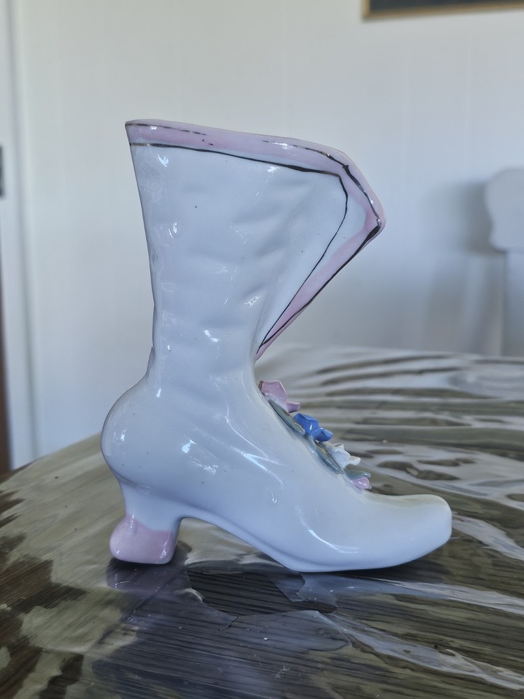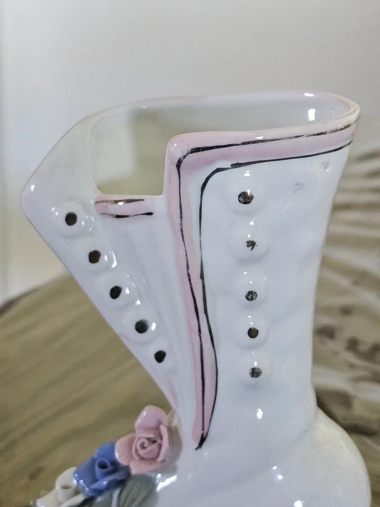 This Ladies Victorian Ceramic Button Boot 3D Bud Vase Planter in blue and ivory color is a unique and stylish decorative collectible piece. With a Victorian theme and flower pattern, this vase adds a touch of elegance to any space. Made of ceramic with a high gloss finish and glazed details, this 6" vase is perfect for displaying flowers or as a standalone decorative item for adults' departments. Its feminine design and period style make it a lovely addition to any collection, especially for those interested in vintage aesthetics.