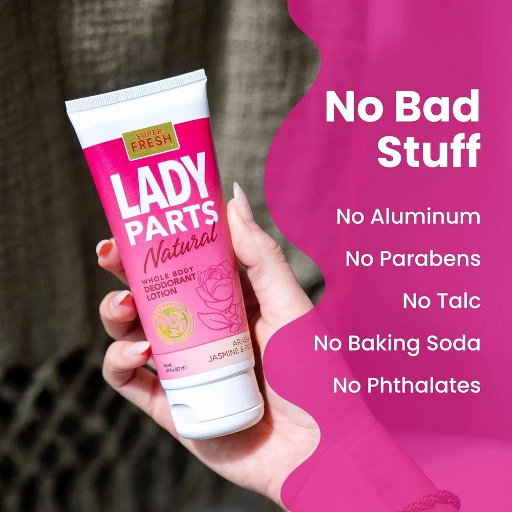 Store New Arrivals Add to Favorite View Feedback Contact Lady Parts Natural Deodorant for Private Parts & Body - Aluminum Free Deodorant for Women - All Day Odor Control for under Boobs, Inner Thigh, Armpits, & Skin Folds - Lightly Scented Jasmine Rose Description Special Feature Hypoallergenic Brand Super & Fresh Co. Scent Jasmine & Rose Material Type Free Aluminum Free Item Form Cream Package Dimensions 5.94 x 2.24 x 1.5 inches; 4.66 ounces Manufacturer Super & Fresh Co. WHOLE BODY NATURAL DEODORANT - Safe and effective for external use on private parts, breasts, backside, body, and feet. Aluminum free deodorant for women designed to keep those lady parts super fresh & comfortable. WOMENS DEODORANT W/ PLANT-DERIVED INGREDIENTS - Super Fresh Lady Parts Natural Deodorant Lotion harnesses the best of nature to ensure you stay fresh "down there" ...and everywhere. A natural blend of powerful deodorizers like mandelic acid, arrowroot, & tapioca starch. NO BAD STUFF - Super Fresh Lady Parts Whole Body Deodorant Lotion is free from all the stuff that makes you cringe. No aluminum. No parabens. No baking soda. No talc. And definitely no animal testing. SMELL AMAZING, STAY FRESH - The Arabian Jasmine & Rose fragrance is floral, sweet, & subtle. You'll love the perfectly balanced fragrant notes of sweet rose, jasmine, bergamot, and lavender SMOOTH LOTION, NON-STICKY, NON-GREASY - This natural deodorant for women applies as an odor-eliminating feminine hygiene cream that dries transparent as an invisible layer of funk-fighting protection that won't stain your clothing. Stay fresh below the belt and everywhere else. FRESHNESS WHERE IT COUNTS ;) - Super Fresh Lady Parts body deodorant for women & feminine hygiene products are proudly formulated, filled, and sealed in the U.S.A. Product Description The Super & Fresh Co. Line-up Add to Cart Add to Cart Add to Cart Add to Cart Add to Cart Add to Cart Add to Cart Customer Reviews 3.9 out of 5 stars 10,728 4.1 out of 5 stars 5,631 4.2 out of 5 stars 7,301 4.3 out of 5 stars 1,769 4.4 out of 5 stars 147 4.2 out of 5 stars 277 4.6 out of 5 stars 1,203 Price $9.99 $ 9 . 99 $13.99 $ 13 . 99 $9.99 $ 9 . 99 $13.99 $ 13 . 99 $13.99 $ 13 . 99 $9.99 $ 9 . 99 $9.99 $ 9 . 99 Whole Body? ✔ ✔ ✔ ✔ ✔ ✔ ✔ Powder Protection? Yes - Lotion-to-Powder No - Invisible Finish Yes - Lotion-to-Powder No - Invisible Finish No - Invisible Finish No - Invisible Finish No - Invisible Finish Deodorizing? ✔ ✔ ✔ ✔ ✔ ✘ ✔ Chafe Control? ✔ ✘ ✔ ✘ ✘ ✔ ✘ Fragrance: Coconut Vanilla Coconut Vanilla Waterman (Aqua-themed) Waterman (Aqua-themed) Arabian Jasmine & Rose Unscented Unscented Ok for Sensitive Skin? ✔ ✔ ✔ ✔ ✔ ✔ ✔ Recommended Sweat Control Products by SweatBlock Add to Cart Add to Cart Add to Cart Add to Cart Add to Cart Add to Cart Add to Cart Customer Reviews 4.1 out of 5 stars 22,313 4.2 out of 5 stars 979 4.0 out of 5 stars 3,621 4.3 out of 5 stars 3,155 4.1 out of 5 stars 1,331 4.1 out of 5 stars 340 3.7 out of 5 stars 1,102 Price $19.99 $ 19 . 99 $19.99 $ 19 . 99 $23.99 $ 23 . 99 $32.99 $ 32 . 99 $24.99 $ 24 . 99 $16.99 $ 16 . 99 $19.99 $ 19 . 99 Primary Benefit: Stop excessive underarm sweat Stop Excessive Underarm Sweat Daily Sweat & Odor Defense Maximum Sweat & Odor Defense Stop Body Sweat Reduce Embarrassing Hand Sweat Reduce Embarrassing Face Sweat Strength: Max Clinical Strength Max Clinical Strength Daily Clinical Max Clinical Strength Max Clinical Strength Clinical Strength Everyday Strength Type: Wipe Roll-on Stick System: Wipes + Stick XL Wipes Quick-Dry Lotion Wipe Fragrance: Unscented Unscented Coastal Fresh Coastal Fresh Unscented Unscented Unscented When to apply? PM: At night before bedtime PM: At night before bedtime AM: Daily as needed Wipes: PM / Deo: AM PM: At night before bedtime PM before bedtime & as needed PM before bedtime & as needed ABOUT US We offer the best prices around on high quality products. Our E-store includes media such as books, movies, music and games while offering electronics, toys, sporting apparel, clothing, tools, general home, garden items and more. SHIPPING We are always working hard to ensure your package arrives as soon as possible. Please understand that some factors like weather, high postal traffic, and the performance of shipping companies are outside of our control. We offer free shipping to the lower 48 states and ship within 2 business days of payment, usually sooner. We do not accept P.O. Boxes. Please provide a physical address. RETURNS We offer a 30-Day Return Policy on items which you are not completely satisfied with. You have the option for a full-refund or an exchange of the item. No returns are available on items shipped outside of the USA. PAYMENT We accept PayPal. CONTACT US This page content is yet to come Please ad us to your favorite seller and visit again later Thank You CUSTOMER SATISFACTION We try our very best to make sure every customer is completely satisfied. If there's a problem, message us! We're happy to help.