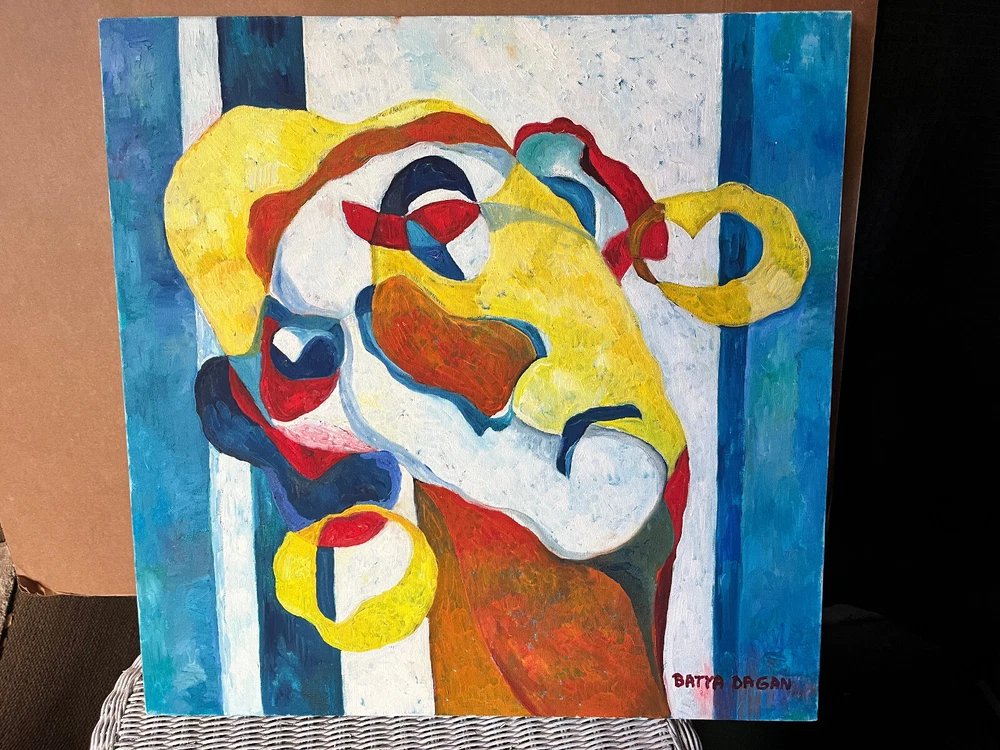 Abstract oil painting of a psychedelic face. "Lady with Earrings," as this painting is called, is a very modern abstract portrait. It's especially notable for its bold, angular planes and its mosaic-like sections, that fit together like an absurd puzzle. This is from the late 80s, and it's by acclaimed American artist Batya Dagan (1933-2013). Dagan was a L.A. based Israeli artist who had an bold, expressionistic style often compared to LeRoy Neiman. Her work included portraiture, abstracts and still lives. She was also a poet and a leading figure in the Jewish community. Measures 24" by 24" and is signed in the front. Has some faint yellow spots on the back. I'm having a SPECIAL SALE where if you search "Oil Painting" in my shop and find another Oil Painting you'd like, I will give you half off the second one! Please take a look at my storefront at: https://www.ebay.com/str/fabfinds42