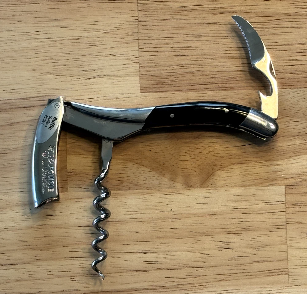 Laguiole en Aubrac Corkscrew. Buffalo Horn handles. Guilloche Deluxe Model. Hand Carved Bee. Made in France. New with Box & Certificate.
