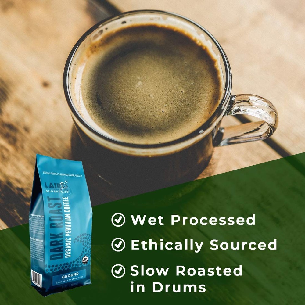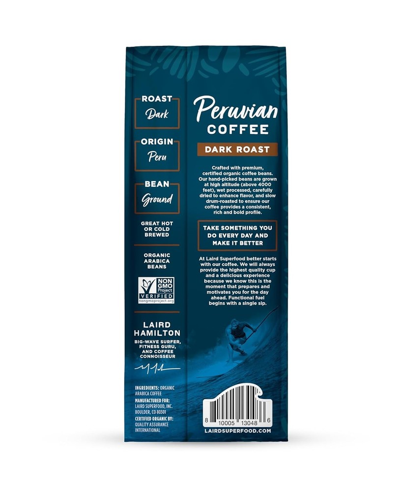 Laird Superfood Peruvian Dark Roast Caffeinated Ground 12 Ounce (Pack of 1) Product Details Product Dimensions : 3.15 x 1.57 x 7.09 inches; 11.99 ounces Item model number : 2251 UPC : 810005130486 Manufacturer : Laird Superfood, Inc. Units : 12.0 Ounce Brand: Laird Superfood Item Form: Ground Flavor: Dark Roast Caffeinated Ground Caffeine Content Description: Caffeinated Roast Level: Dark Roast FAIR TRADE ORGANIC COFFEE - Laird's Coffee Arabica beans are organically grown at high altitudes. We think you'll agree that they produce incredibly complex flavors that yield phenomenal tasting coffee DELICIOUSLY CRAFTED DARK ROAST - These beans are wet-processed and carefully dried to prevent taste contamination from the cherry flesh HIGH ALTITUDE BEAN - This HB Class bean is grown at an altitude of 4,000+ feet and hand-picked to ensure the ripeness of each & every coffee cherry SLOW ROASTED COFFEE BEANS - Laird Superfood pays special emphasis during the critical roasting phase by employing a specialized drum roaster to process our valuable beans in small batches FRESHLY ROASTED - The smooth medium roast flavor stays fresh longer due to our proprietary packaging system, which reduces oxygen content to 0%
