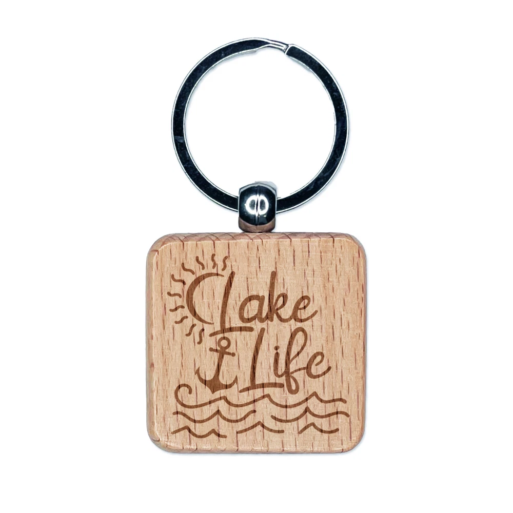Lake Life with Anchor Engraved Wood Square Keychain Tag Charm
