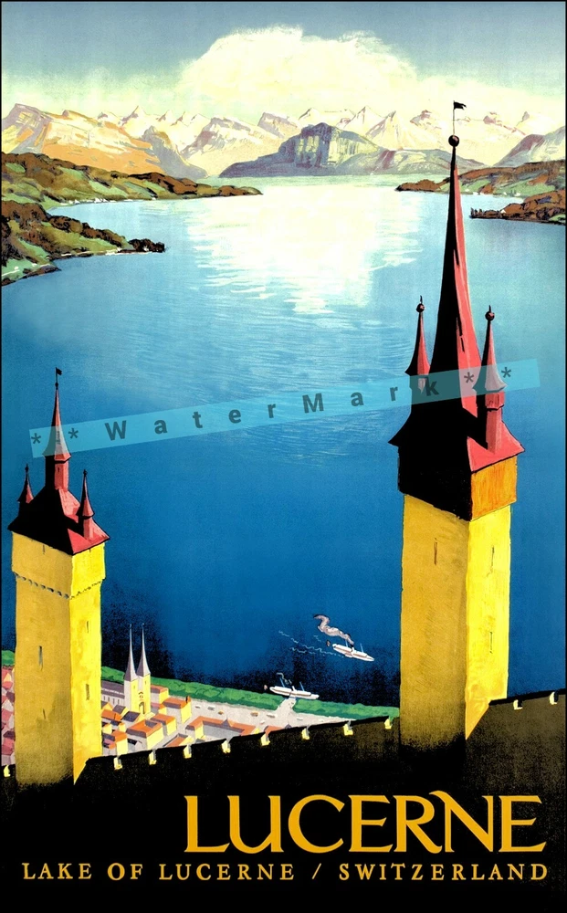 Switzerland Lake Lucerne 1930 The lake is unusual because it has a very irregular shape, with many bends and turns and four arms . The shores of Lake Lucerne are partly formed by steep mountains like the Rigi and Pilatus, bordered by fabulous towns like Lucerne and Weggis, and are the site of Switzerland's oldest history. Vintage Poster Print Retro Style Restored Art ***We offer Free US Postage or Reduced Postage for Canada & Worldwide. **No charges for additional prints worldwide. ***These are not framed or stretched or mounted NOTE:**Delivery dates shown are only "Suggested" Order Early To Avoid Post Delay Dramas **Read Please: The print looks best with a nice mat (passe - partout or passepartout ) and frame. These prints are the exact proportion as the original and will not be stretched to fit the paper or canvas...this would cause a distorted print The image will be the exact aspect ratio as per the original poster, so there might be more white on the top and bottom, or side to side. Options available..use the drop-down menu * Watermark will not be on your image. *Cloth Canvas an artist canvas used also in museums and art galleries *Photo Gloss Paper is a high-quality Professional Photo paper *Matte Photo Paper is a great solution if you do not want a Gloss, this paper is great with colors *Luster Photo Paper this photo paper is neither glossy or matt. Glossy paper has a smooth texture, luster paper is slightly textured. This option is a good choice for something in between Metallic, Photo Gloss and Matte *Metallic Pearlescent Photo Paper is a very high-quality paper with a Pearlescent sheen, a glossy finish, and unique metallic appearance, these prints have extra visual interest and depth. This paper uses a combination of film laminate layers that produce striking, dimensional, lasting images on an ultra-bright background. The effect is sometimes described as "chrome on paper." This is NOT a metal plaque, it is a photo paper This poster print will be shipped in a sturdy container. We will ship usually within 24 business hours of payment, except for weekends or US Holidays If there is a question, please do contact me All is done to send you the best quality poster image. Don't forget to check out the Sales. There is a great Buy 3 Get 1 Free Offer!! Shipped with no extra postage..Worldwide! There are a variety of reasons why the images on your monitors don't match each other. The simplest is that each monitor is different; even monitors with the same model won't have colors that match up perfectly We are located and ship only from the USA The art is not AI generated, these are restored prints from originals