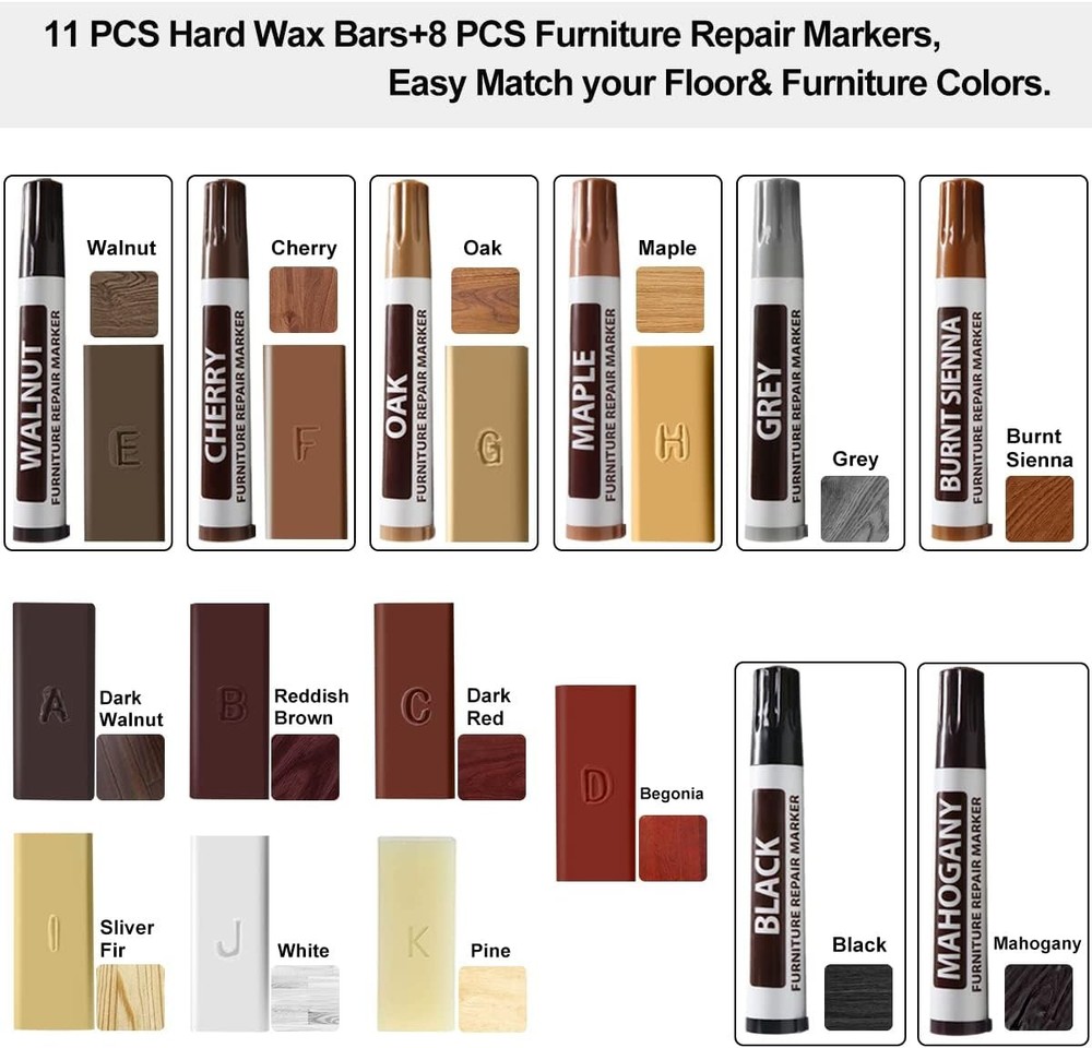 Free eBay listing template designed by dewiso.com Laminate Vinyl Floor Repair Kit with Heat Pen, 11 Colors Hardwood Floor Wax Wood Furniture Touch up Marker Linoleum Lvp Repair Kit Covers Scratches, Stains, Cracks, Holes for Floor, Door, Cabinet FREE AND FAST SHIPPING! Vinyl Floor Repair Kit: Say no to other complicated repair kits and steps, just need a wood floor repair kit for discoloration, stains, scratches, nicks, cracks, or holes on any wood floor and wood furniture luxury vinyl plank, laminate, bed, cabinet, table, frame, door, desk, etc. Your DIY repair work will become simple and professional, also save your time and money Upgraded Hardwood Floor Restoration Kit: After switching from "OFF" to "ON", the heat pen will be heated continuously, you don't need to press the button to heat all the time, after switching from "ON" to "OFF", the heat pen will go off. Anyone can use easily, even for left-handed people, and compared with wood filler and wood putty, our restoration hard wax bars is fast drying and waterproof, after curing, the wax is durable and abrasion resistant Wood and Laminate Floor Furniture Marker Repair Kit More Colors: 11 colors of hard wax strips and 8 wood repair markers can easily match your wooden furniture and floors, high-quality furniture repair repair markers can be used to repair surface scratches or draw wood grain. Apply from light to dark, pay attention to color changes, it is best to mark or blend colors as far as possible where they are not visible, or mix different colors to perfectly match the desired color with your wooden furniture, laminate flooring, vinyl flooring, and linoleum flooring Easy to Use Vinyl Floor Repair Kit: Just put the appropriate color of wax close to the damaged area of the melted wax until it overflows slightly. Wait for a while for the wax to dry, and then use a scraper to remove the excess wax. If necessary, you can use a lighter to speed up the heating of the wax. Excellent Customer Service: We provide a 100% satisfaction customer service team and support 1 year free replacement. If there are any issues with our laminate floor repair kit, we will respond to you within 24 hours Product We offer a 30-Day Return Policy on items which you are not completely satisfied with. You have the option for a full-refund or an exchange of the item. No returns are available on items shipped outside of the US . Shipping We offer Free Shipping to the US and ship within 2 business days of payment, usually sooner. We use UPS express shipping. That's why your products are usually delivered within 3 days . Contact We try our very best to make sure every customer is completely satisfied. If there's a problem , message us! We're happy to help. 24/7 live chat available.