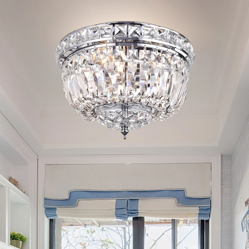 Brighten your room while putting your sophisticated style on display with this chrome and crystal ceiling lamp. The stunning prism design and polished chrome frame creates an elegant addition to your living space. Setting: Indoor Number of lights: 3 Requires Requires 3, 60-watt E12 light bulbs (NOT INCLUDED) Line switch Light Bulb Type: Incandescent Lighting Type: Flush Mounts Product Features: CSA Listed, ETL Listed, UL Listed Material: Chrome, Crystal Assembly: Assembly Required Switch Type: Hardwired Light Direction: Multi-directional Lighting Style: Traditional, Glam Finish: Chrome Finish Color: ClearMeasures 9.5 inches in diameter x 7.2 inches highAssembly RequiredThis fixture does need to be hard wired. Professional installation is recommended. Free Shipping Over $49.99* Details Landek Chrome 10-inch Crystal Ceiling Lamp Product Description: Brighten your room while putting your sophisticated style on display with this chrome and crystal ceiling lamp. The stunning prism design and polished chrome frame creates an elegant addition to your living space. SettingIndoor Number of lights3 Requires Requires 3, 60-watt E12 light bulbs (NOT INCLUDED) Line switch Light Bulb TypeIncandescent Lighting TypeFlush Mounts Product FeaturesCSA Listed, ETL Listed, UL Listed MaterialChrome, Crystal AssemblyAssembly Required Switch TypeHardwired Light DirectionMulti-directional Lighting StyleTraditional, Glam FinishChrome Finish ColorClear Measures 9.5 inches in diameter x 7.2 inches high Assembly Required This fixture does need to be hard wired. Professional installation is recommended.